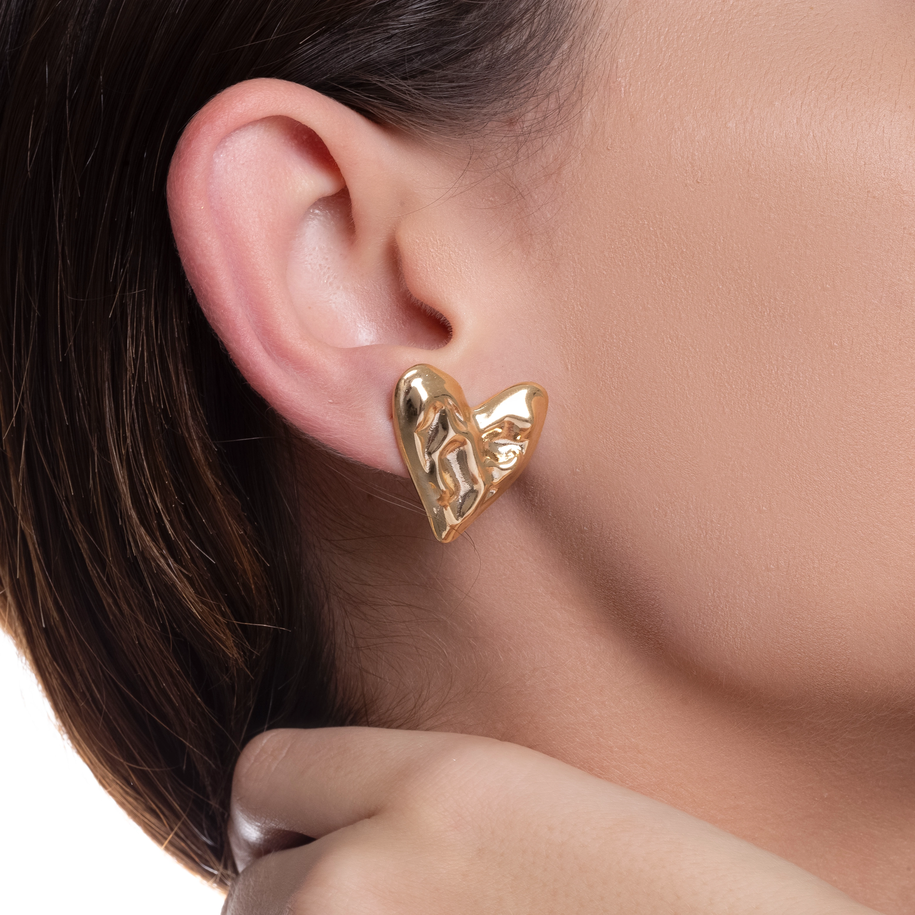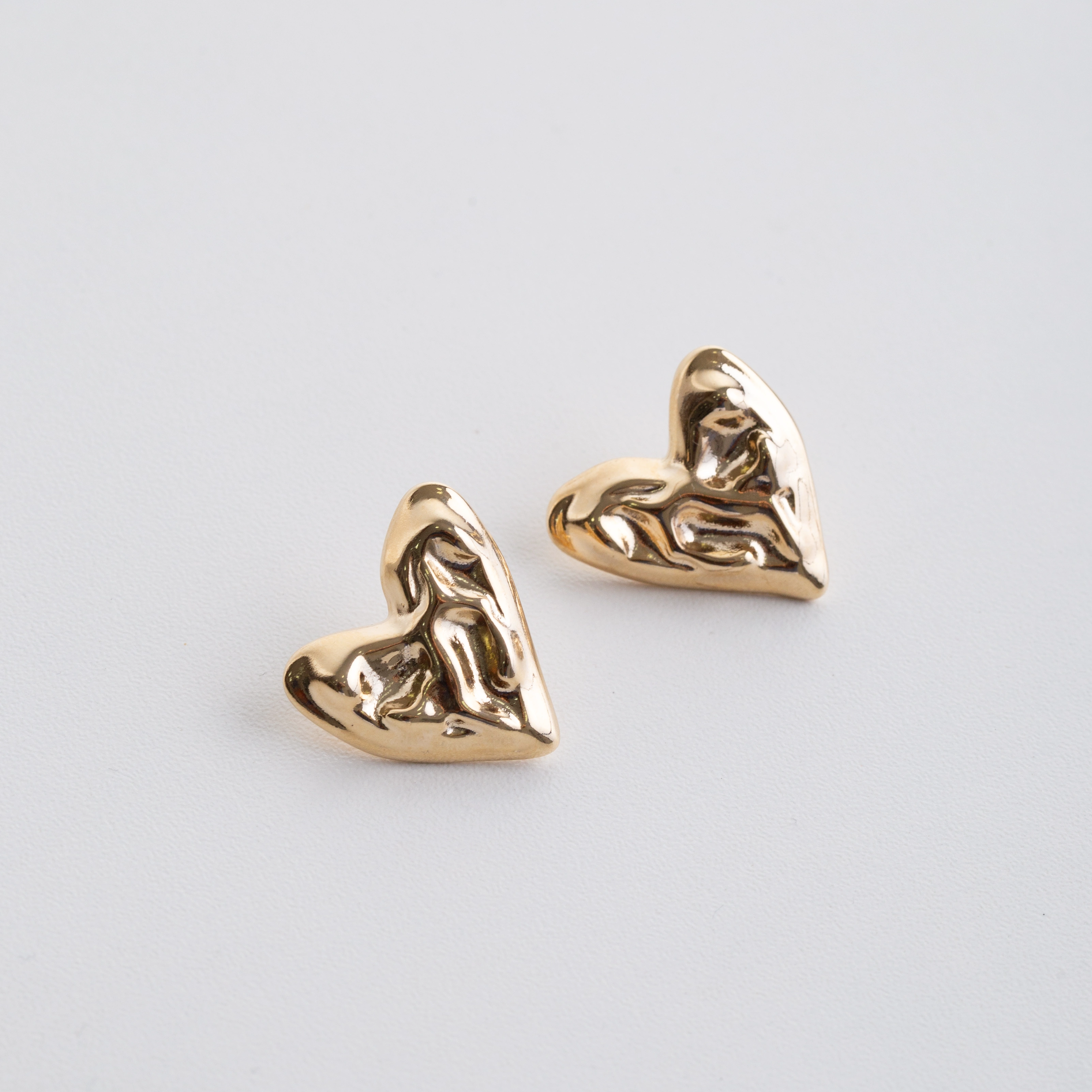 Nuestros pendientes de botón de corazón martillado combinan textura y ternura en su diseño. Cada pendiente está elaborado con baño de oro de 18k, presentando un corazón con un distintivo acabado martillado que capta la luz con cada movimiento. Estos pendientes son una adición sutil pero cautivadora a su colección de joyas.