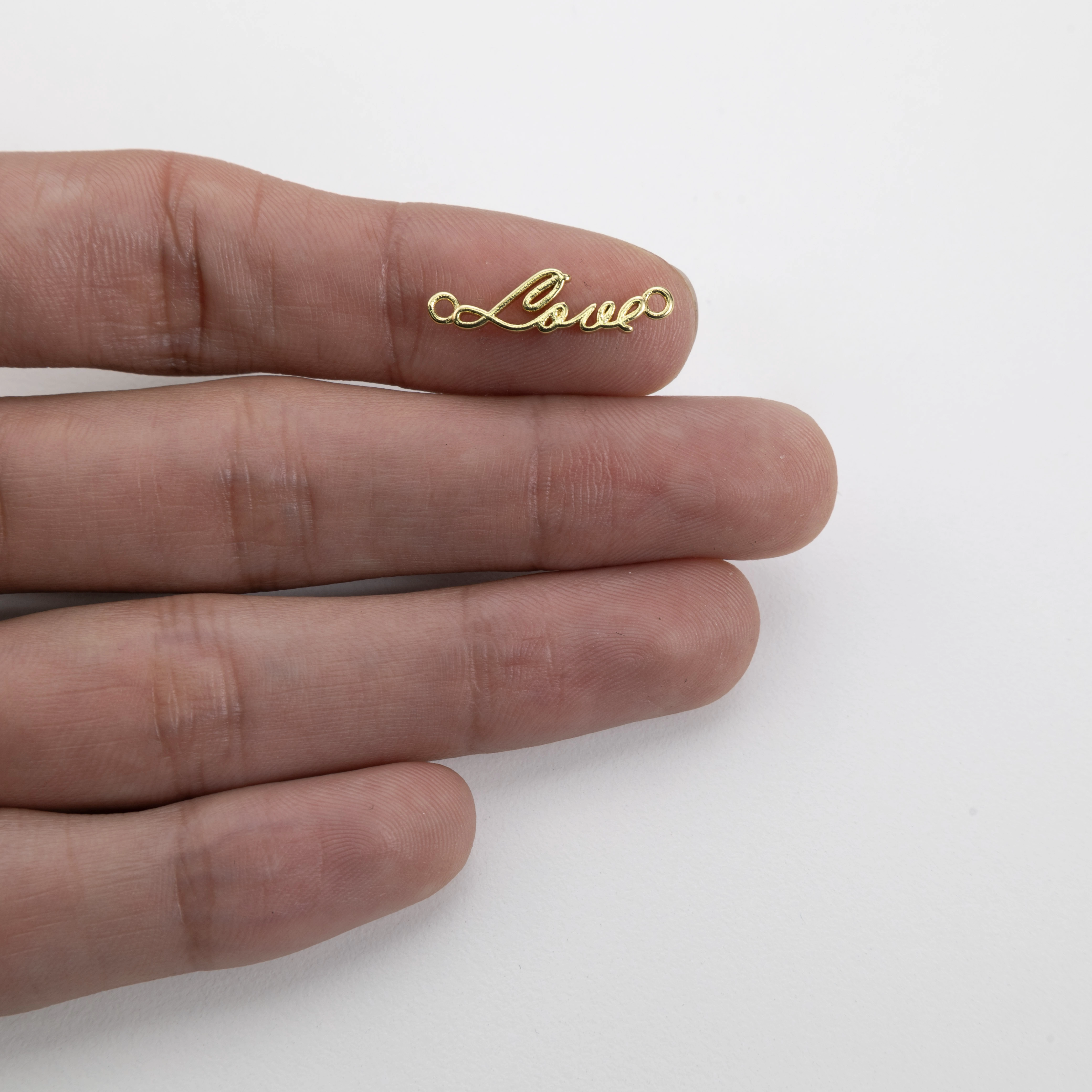 Este exquisito conector Love captura la esencia del romance y el afecto en su elegancia cursiva. Acabada en un hermoso baño de oro, esta pieza es perfecta para añadir un toque de calidez y amor a cualquier creación de joyería.