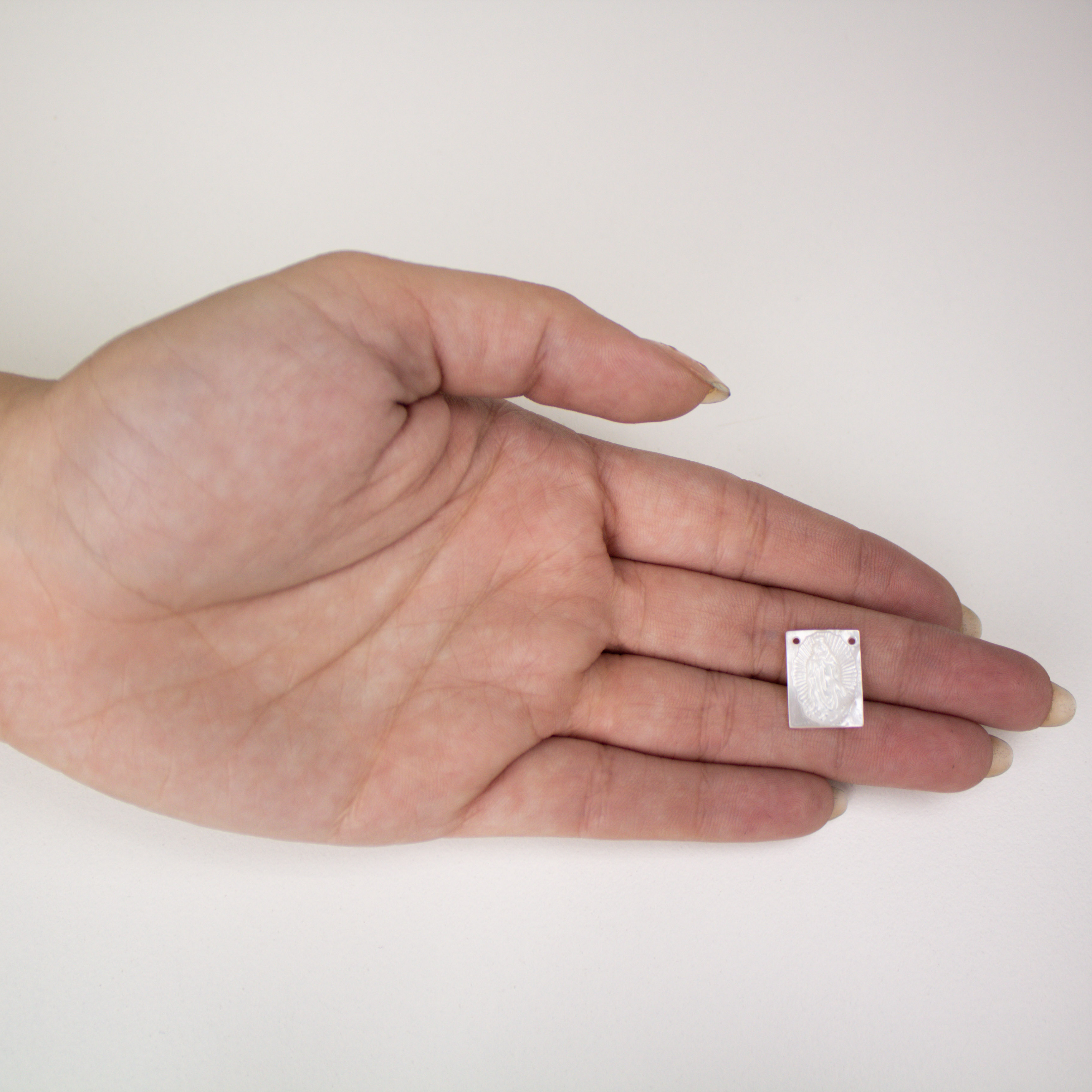 Rectangular mother of pearl charm with a delicate engraved religious image, perfect for adding a spiritual and elegant touch to any necklace or bracelet. This charm combines the softness of mother of pearl with a design that inspires peace and devotion