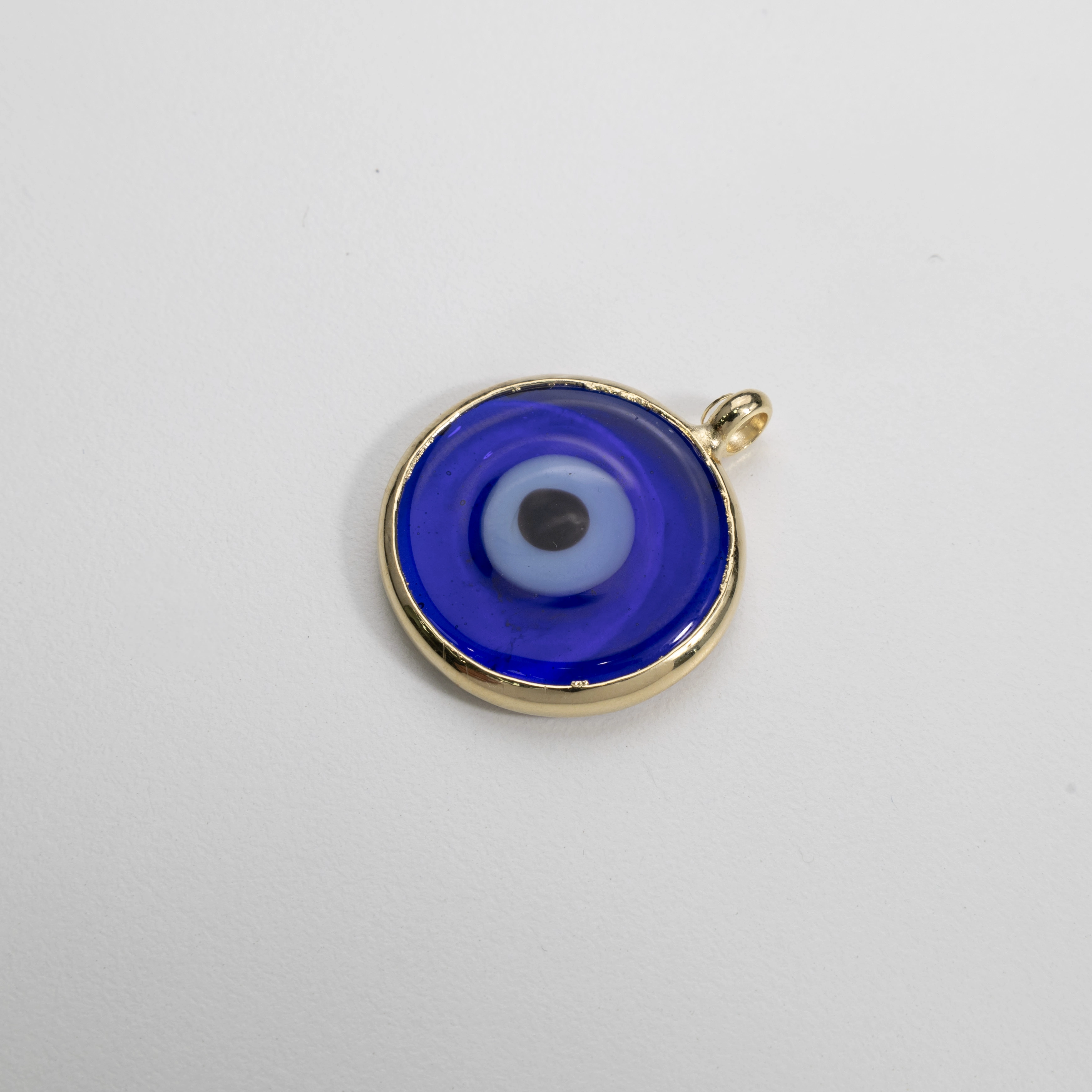 This charm features the iconic eye motif in a harmonious blend of blue and white, set within a round bezel frame.