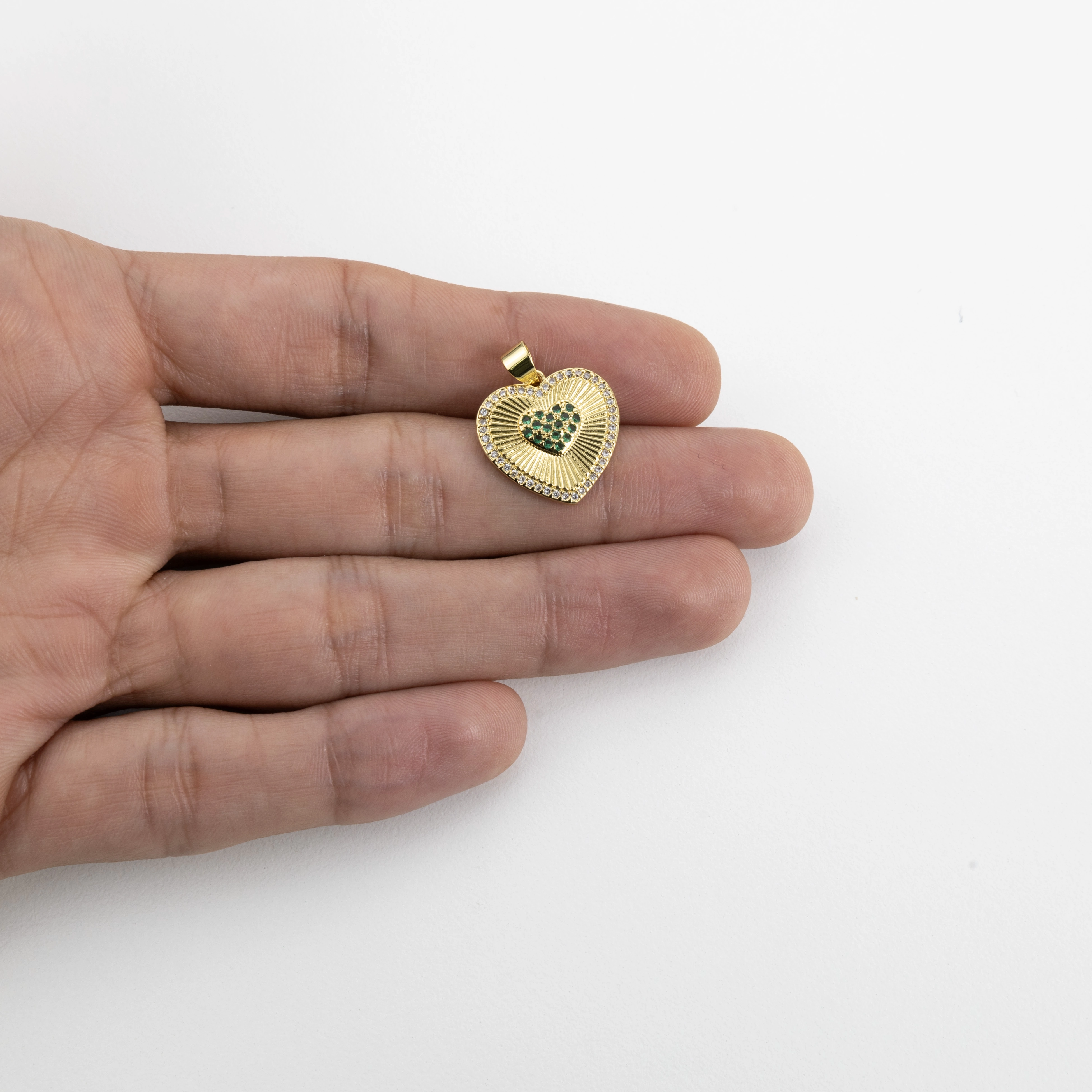 Crafted with precision by Gold Tree Miami, this heart-shaped pendant exudes elegance and charm. Bathed in 18k gold, it is adorned with dazzling green crystals, making it an ideal centerpiece for creating your own unique piece or collection. Enhance your jewelry ensemble with this luxurious heart, reflecting love and sophistication.