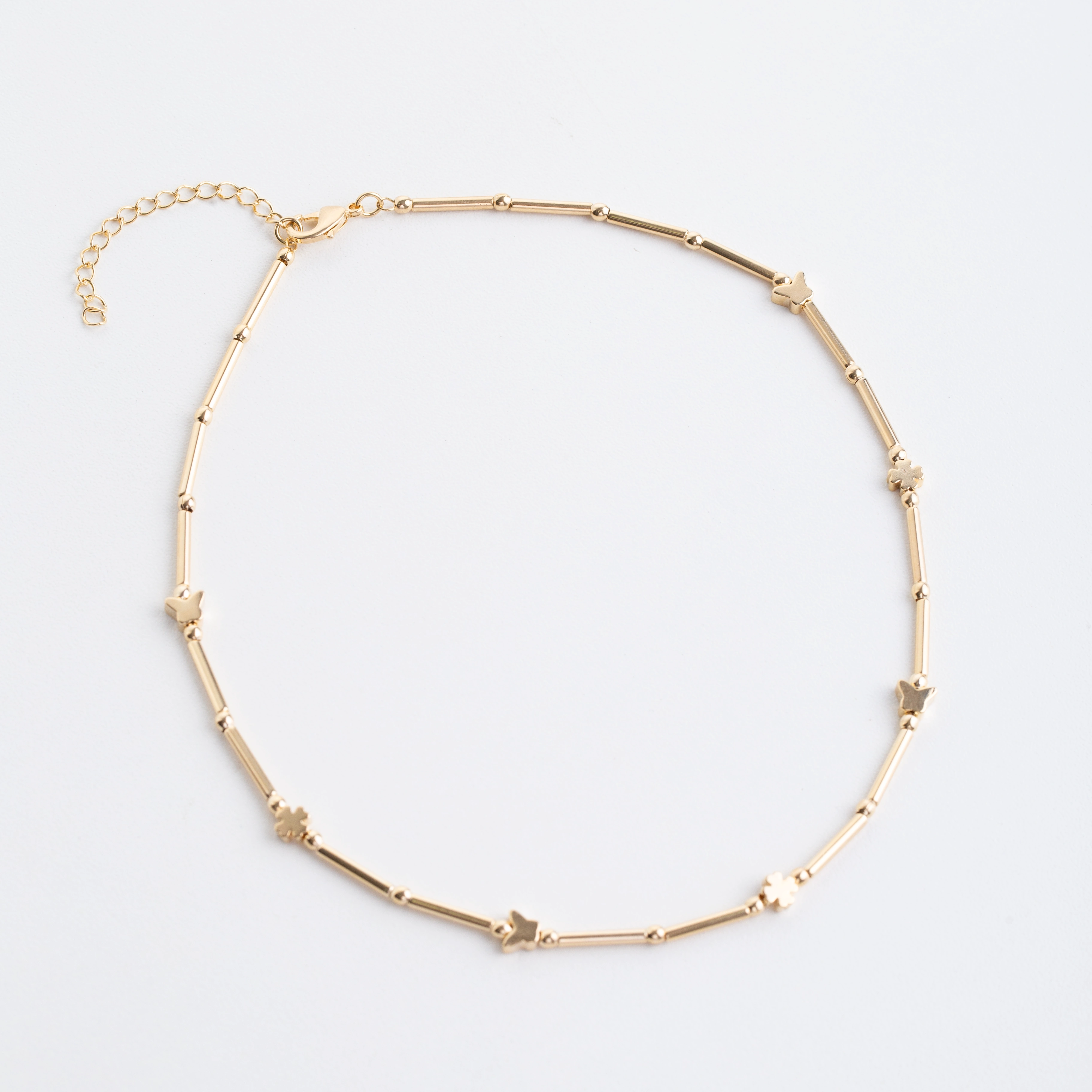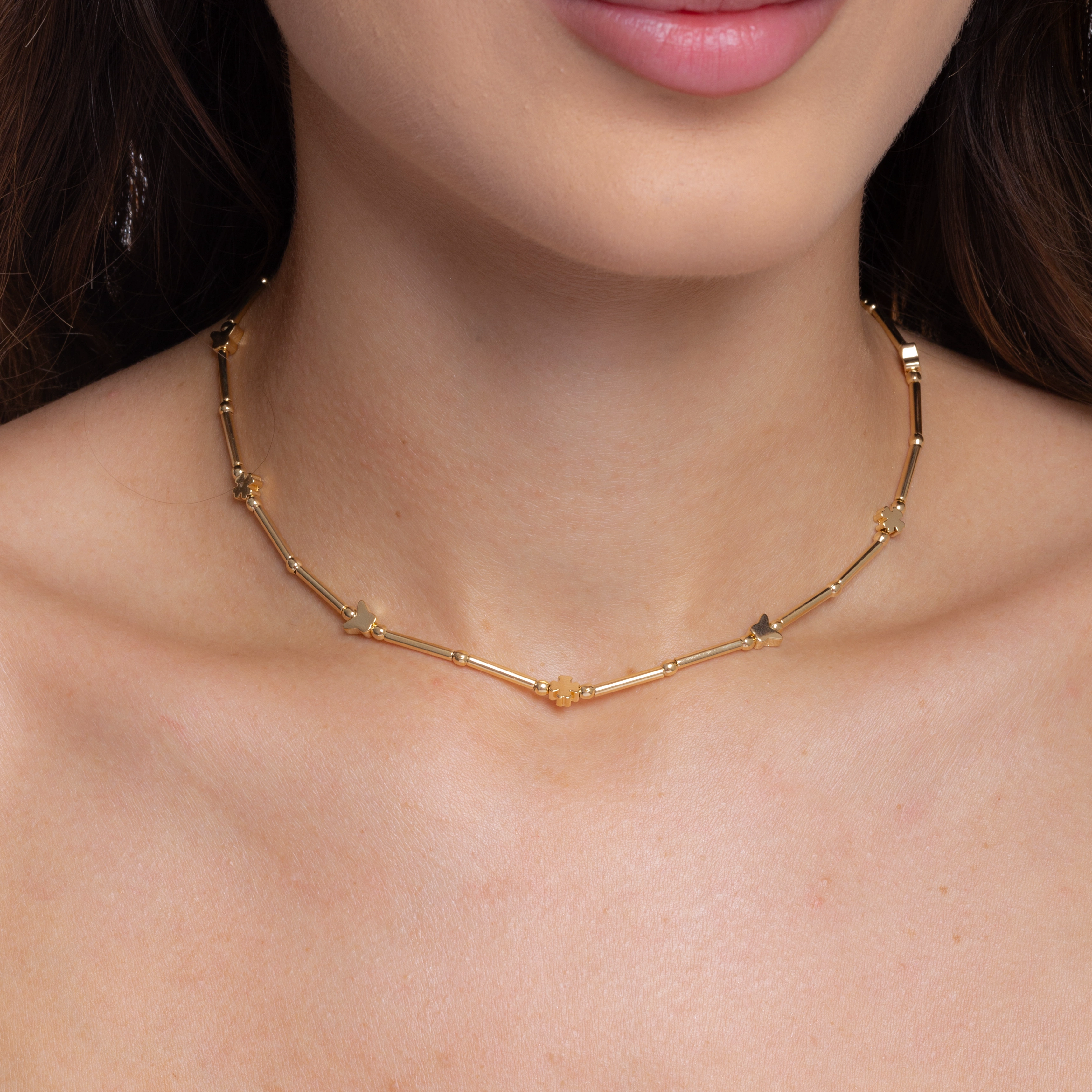 Embrace the beauty of nature with our Fluttering Blossom Bar Necklace, plated in radiant 18k gold. This enchanting piece intersperses sleek gold bars with delicate butterfly and flower motifs, symbolizing growth and transformation. Its elegant design captures the whimsy of a garden in bloom and the grace of butterflies in flight, making it a poetic addition to any wardrobe
