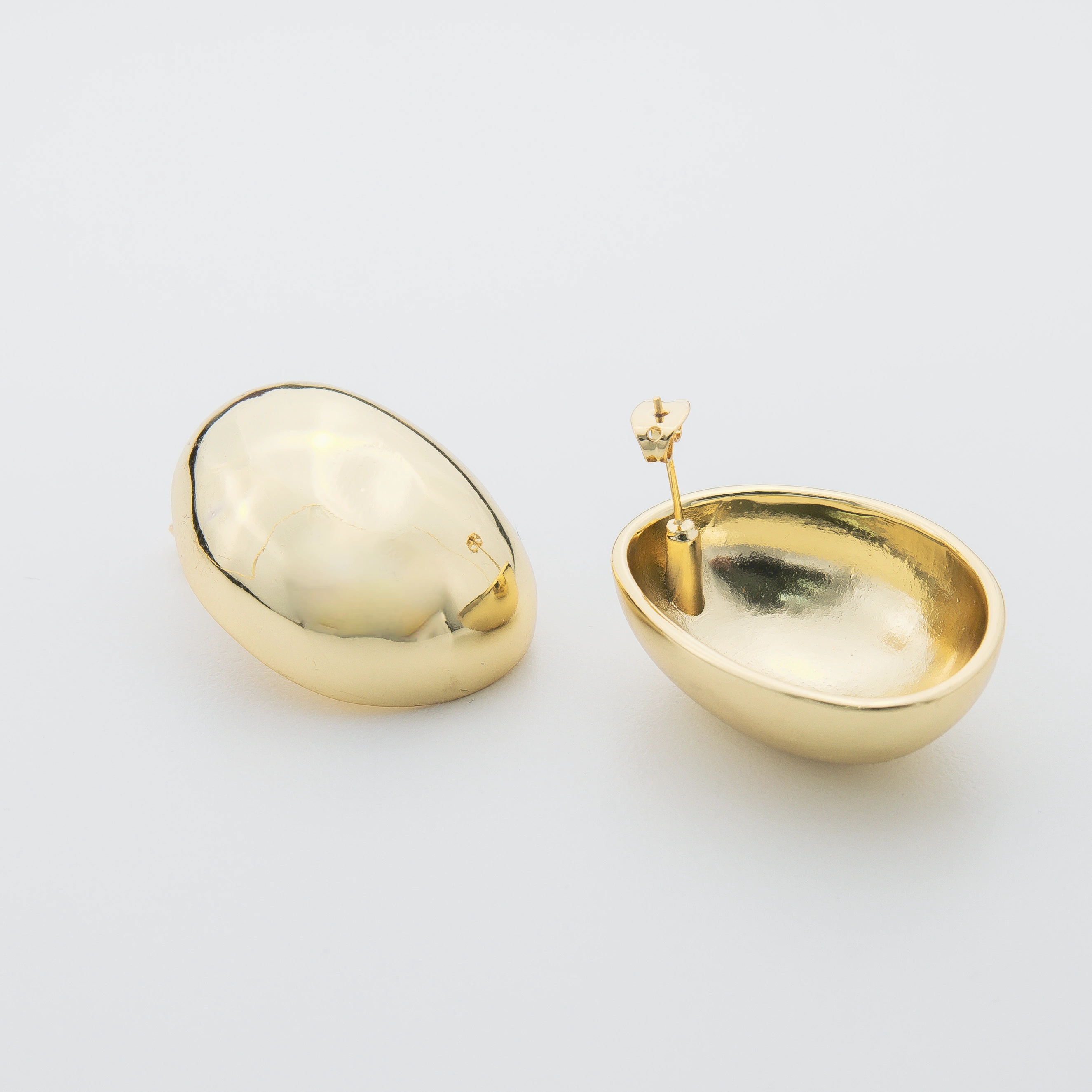These Golden Oval Dome Earrings from Gold Tree Miami exude a sleek, contemporary vibe. The smooth, 18k gold-plated domes provide a mirror-like finish that catches and reflects light from every angle, offering a bold statement piece that is both minimalist and eye-catching.