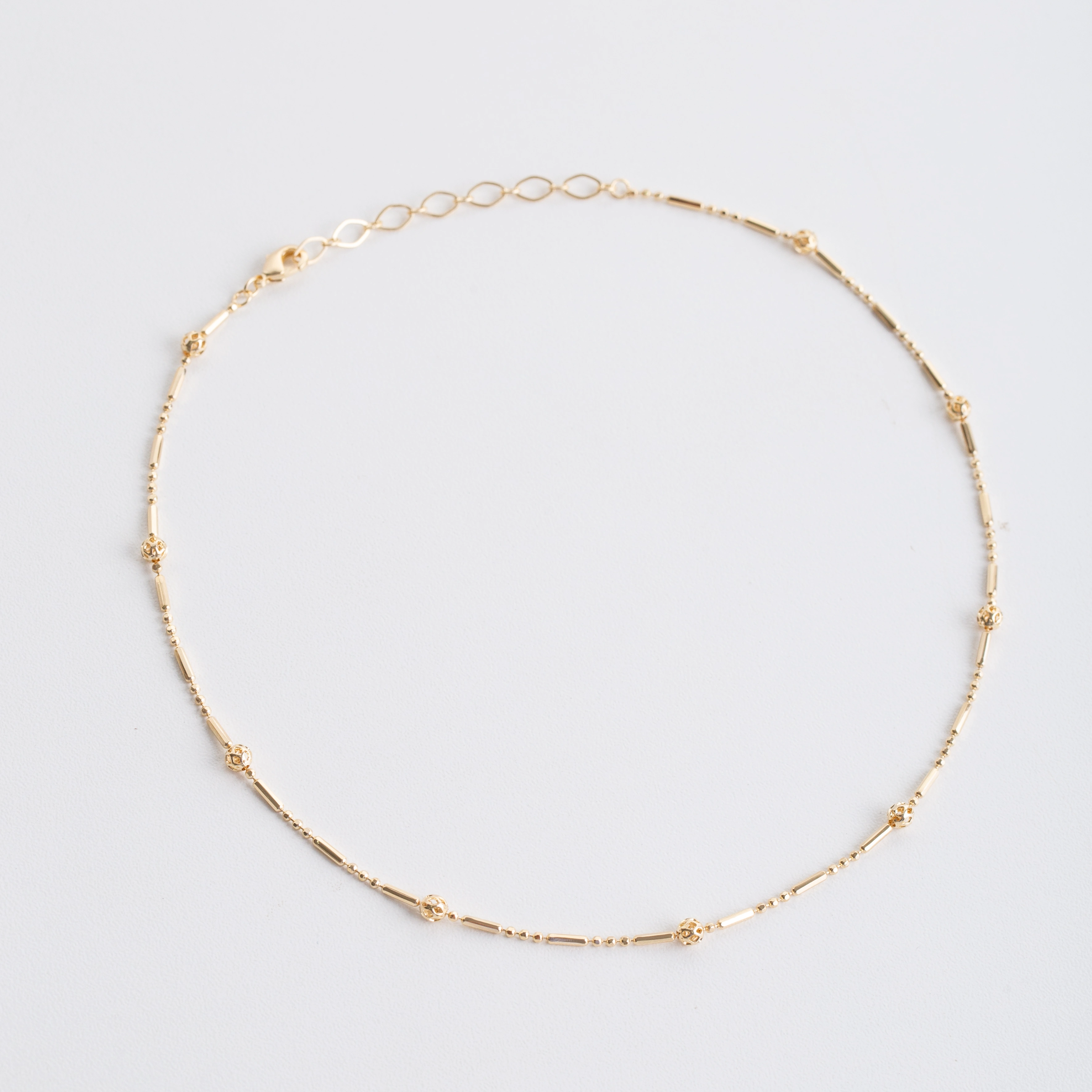 Our 18k Gold-Plated Chain with Mini Beads and Rods is a testament to the charm of simplicity. Crafted with precision, the chain alternates between lustrous mini beads and sleek golden rods, creating a rhythm of texture and shine. Designed for versatility, it’s a refined addition to any attire