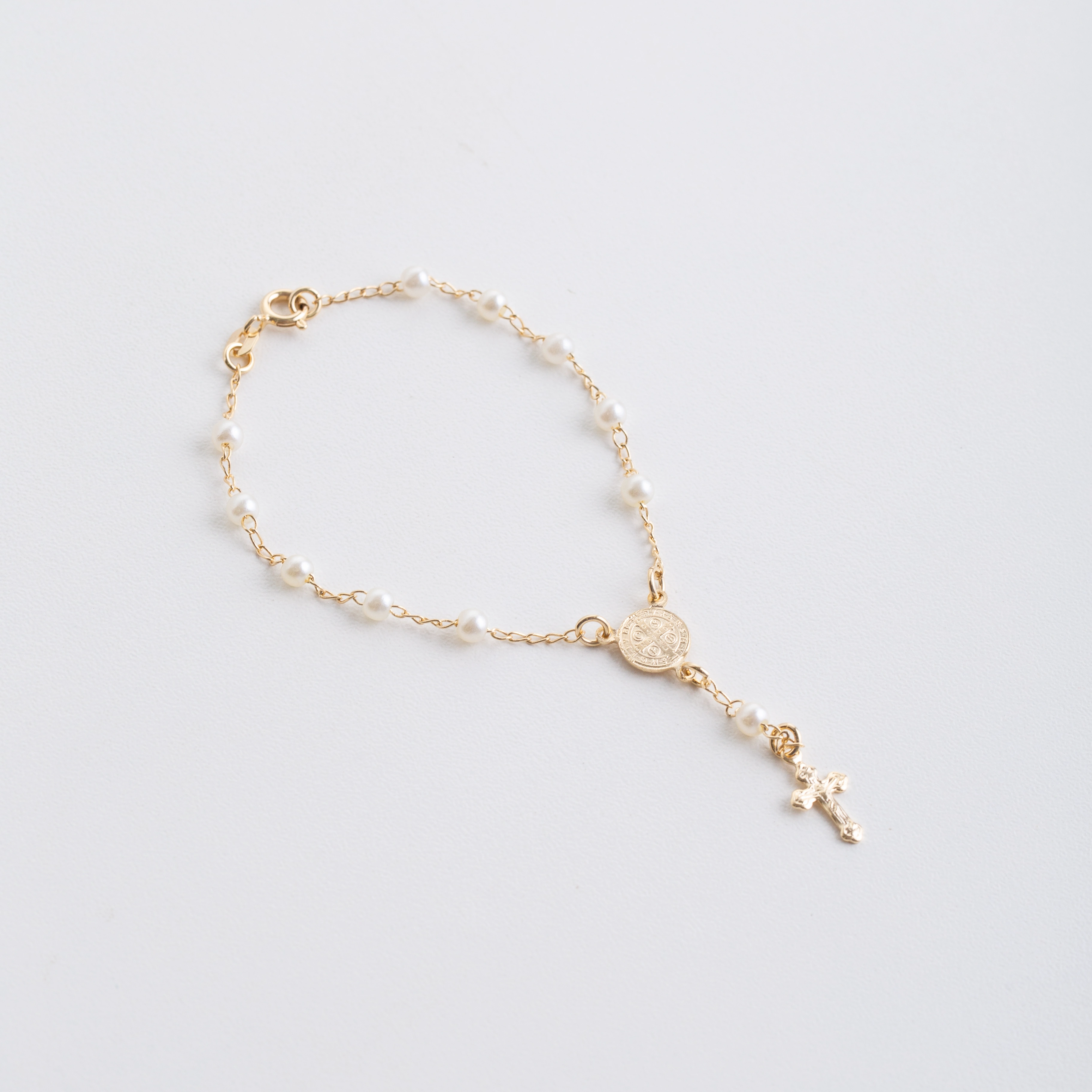 Adorn your wrist with the serene beauty of our Elegant Pearl Bracelet featuring a delicate gold-plated cross charm. This bracelet marries classic elegance with spiritual symbolism. The lustrous pearls are spaced with precision, leading to a centerpiece medallion and a dainty cross charm that dangles gracefully