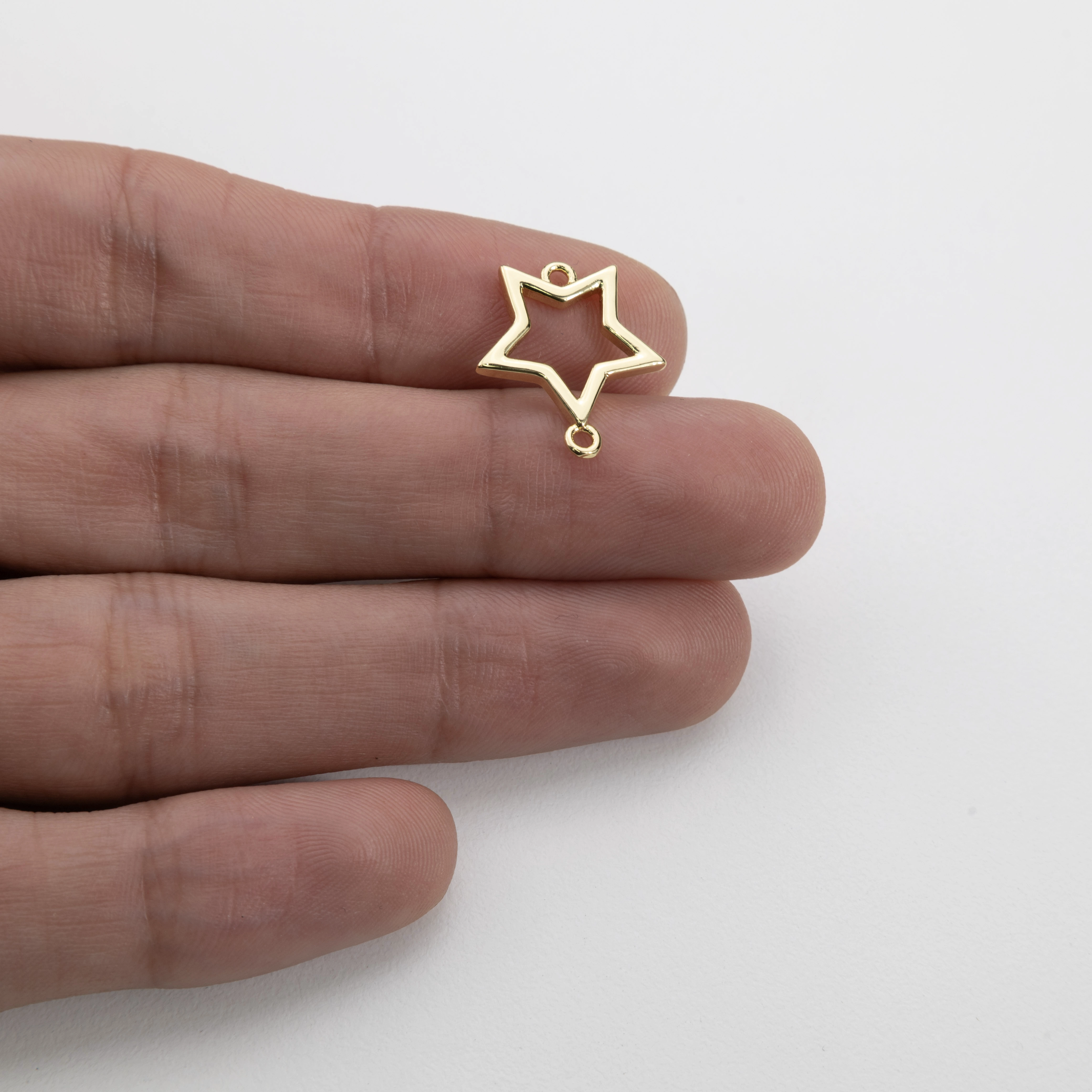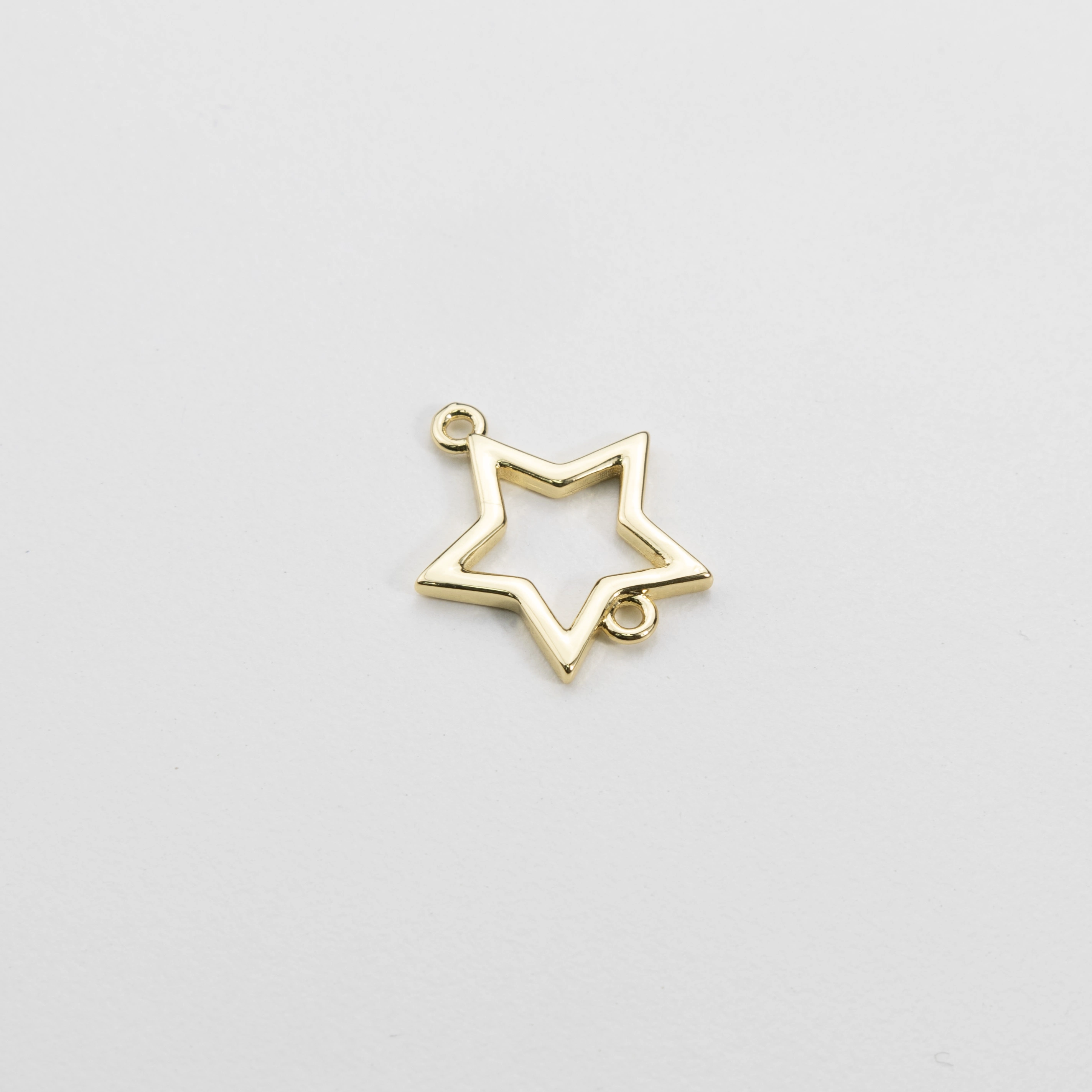 Elevate your jewelry designs with the Golden Star-Shaped Connector Charm from Gold Tree Miami. This elegant connector charm is meticulously shaped into a classic five-pointed star and finished with a radiant 18k gold plating. It serves as a versatile linking piece with loops on two opposing points, ideal for connecting segments of bracelets or necklaces. The charm's open design is not only stylish but also allows for easy attachment of clasps or additional charms, offering endless possibilities for customization