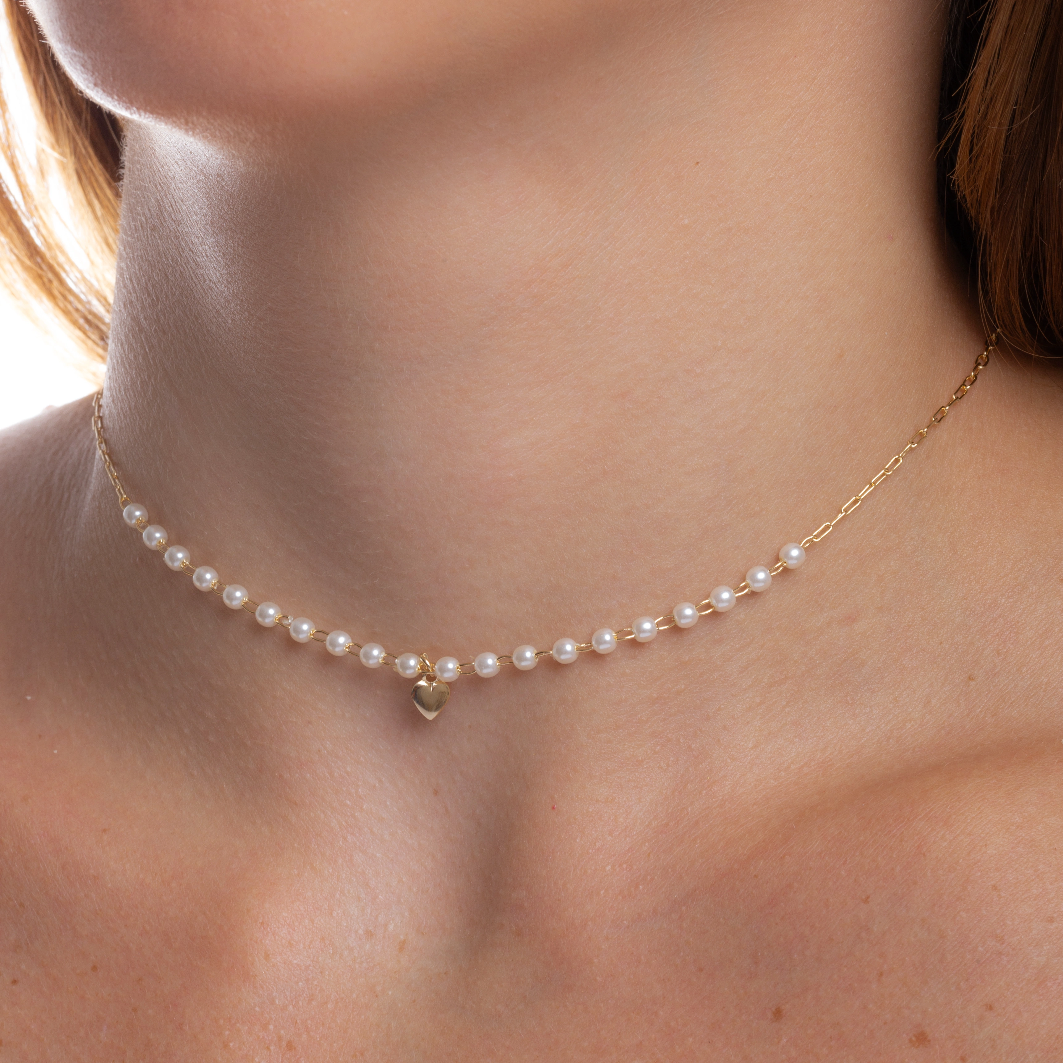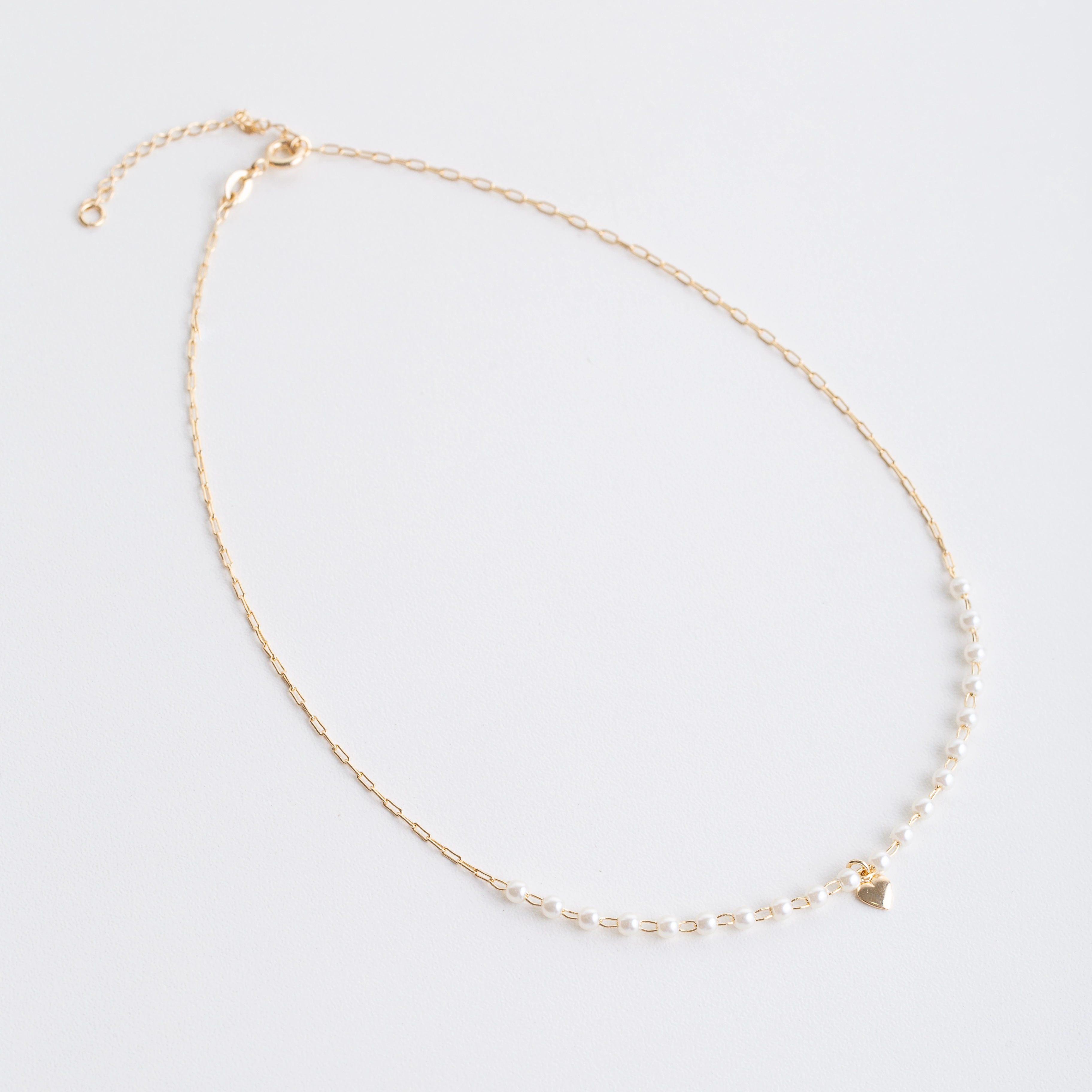 Discover the charm of our Cherished Heart and Pearl Detail Necklace. This exquisite piece, plated in 18K gold, features a string of delicate pearls leading to a dainty heart charm, symbolizing love and tenderness. The pearls provide a classic touch, while the heart pendant adds a personal, sentimental note to your jewelry collection