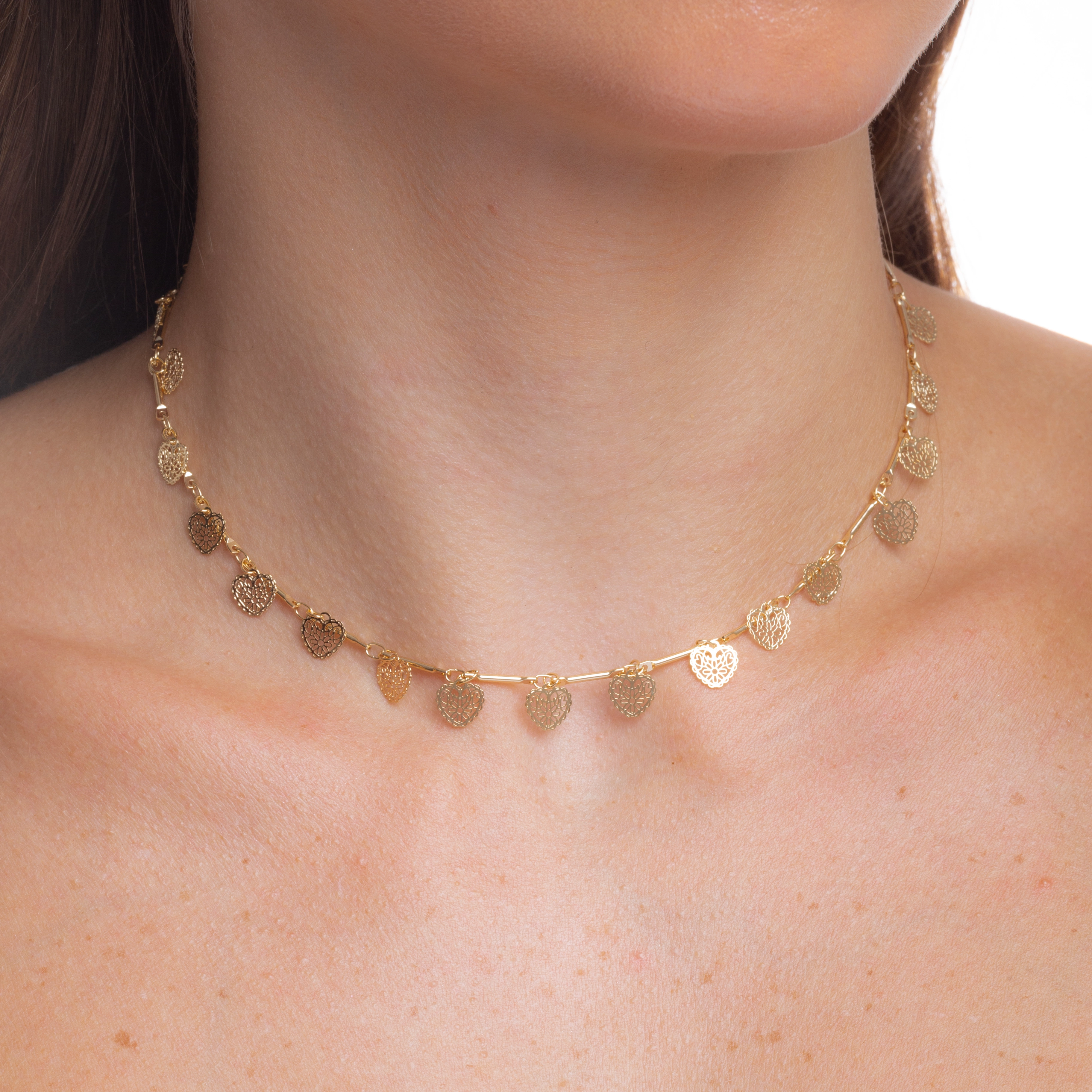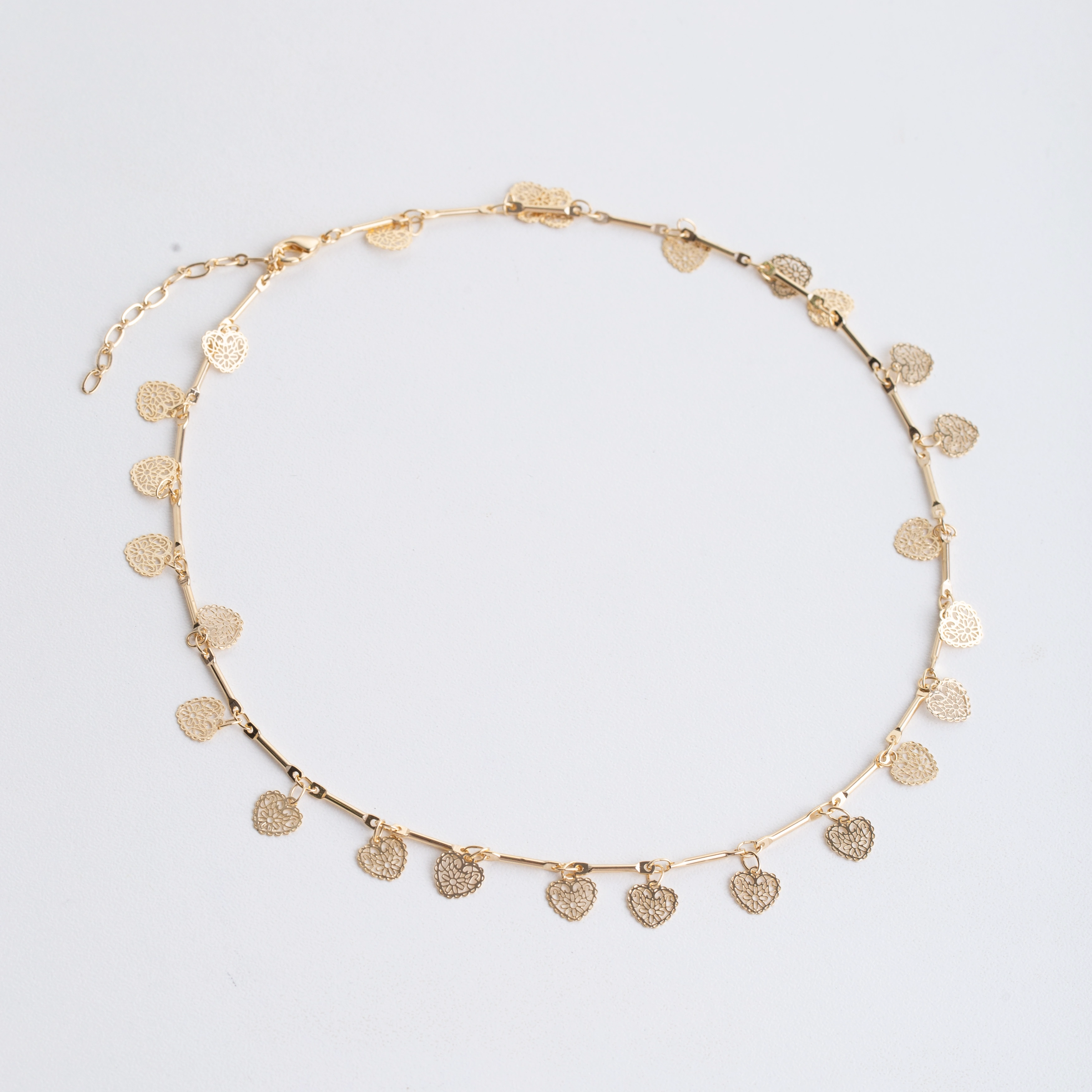 Adorn your neckline with the intricacy of our Filigree Leaf Charm Necklace, plated in resplendent 18K gold. Each finely crafted charm dances along the chain, capturing the light and the essence of nature's artistry. This necklace offers a timeless elegance and a touch of whimsical charm, suitable for both casual and formal attire