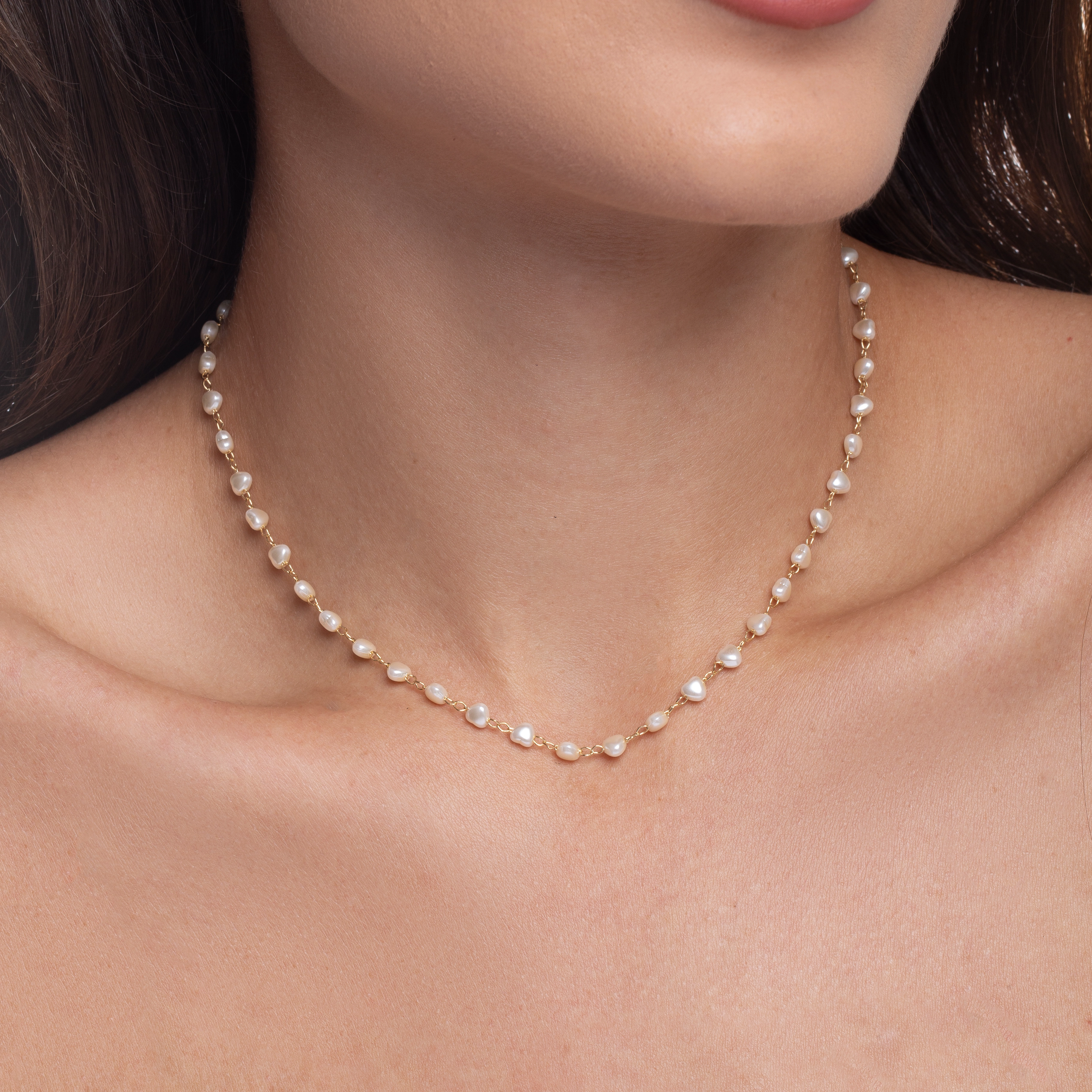 Gold Tree Miami's 'Heart-Shaped Pearl Chain Necklace' is a captivating piece, where the timeless elegance of pearls meets the universal symbol of love. This necklace features delicate heart-shaped pearls, evenly spaced along a dainty chain, offering a romantic twist on the classic pearl necklace
