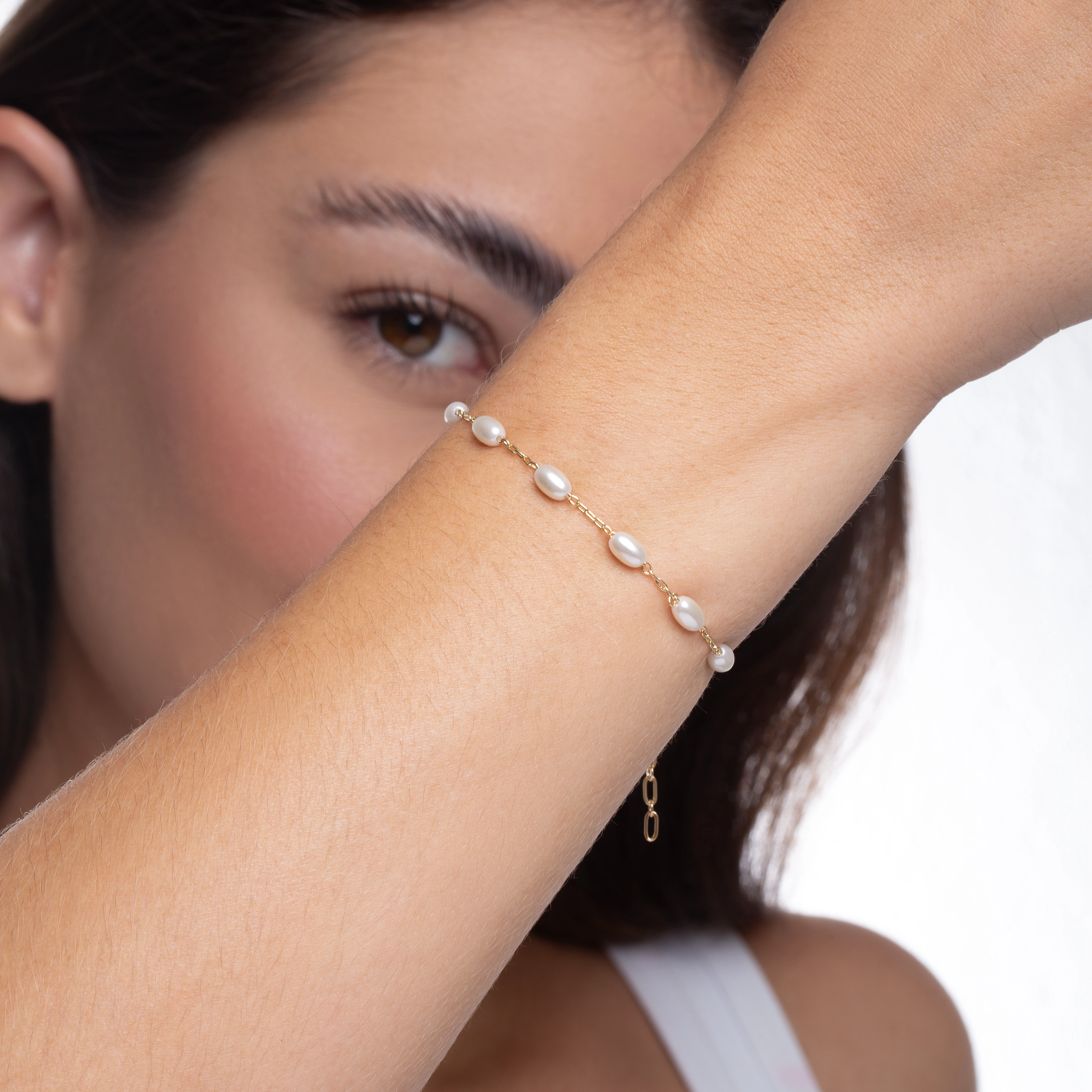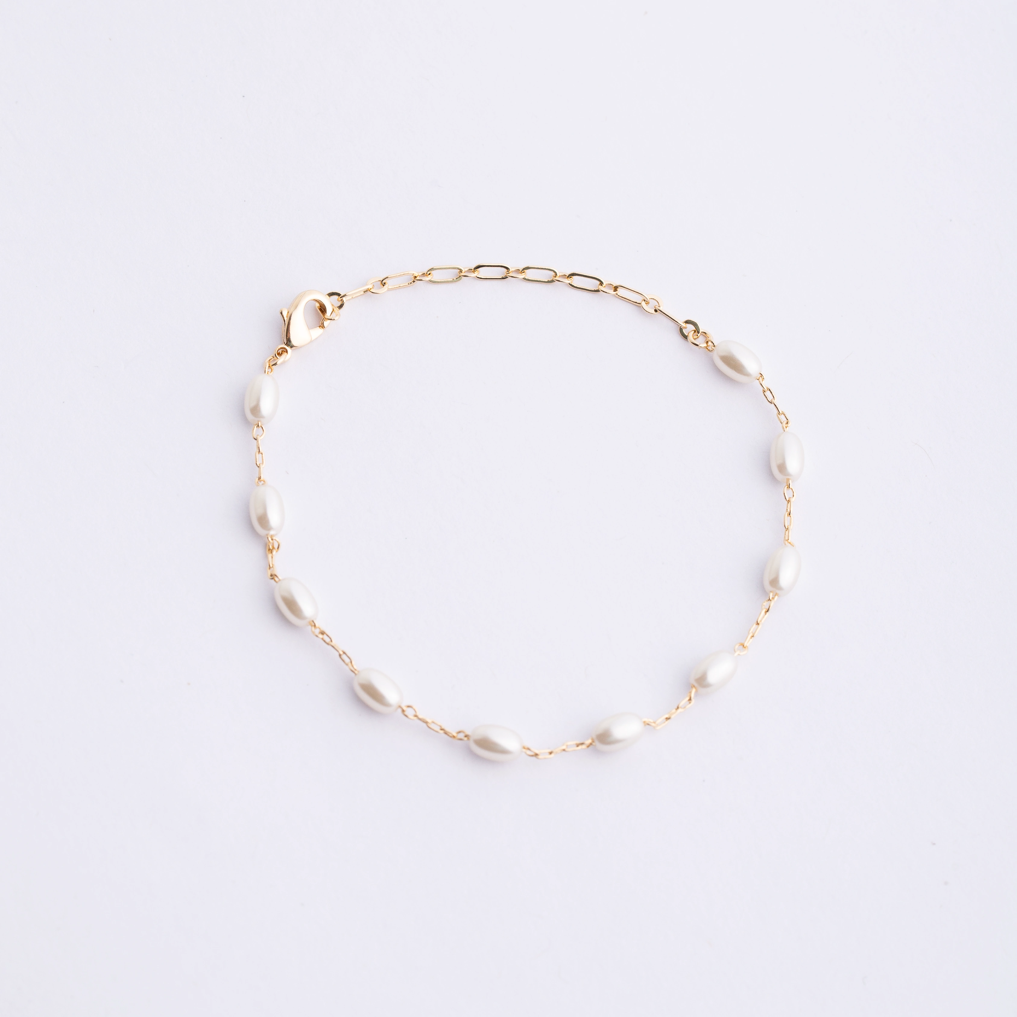 Delicately crafted, this 18k gold-plated bracelet is adorned with exquisite rice-shaped pearls, each pearl a testament to timeless sophistication. The bracelet's light design makes it perfect for daily wear or special occasions, adding a touch of classic beauty to your wrist. Pair it with other pieces to create a layered look or let it stand alone as a symbol of elegance and grace