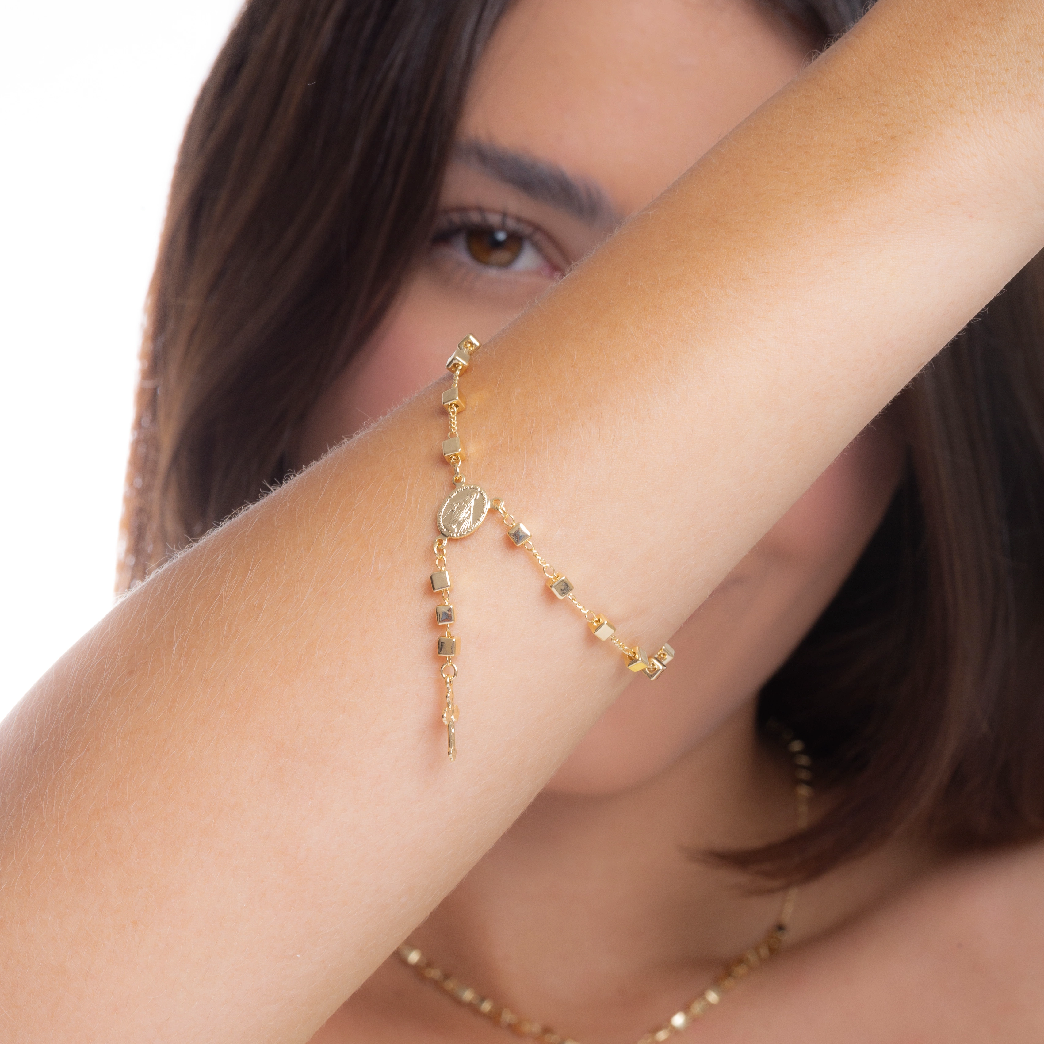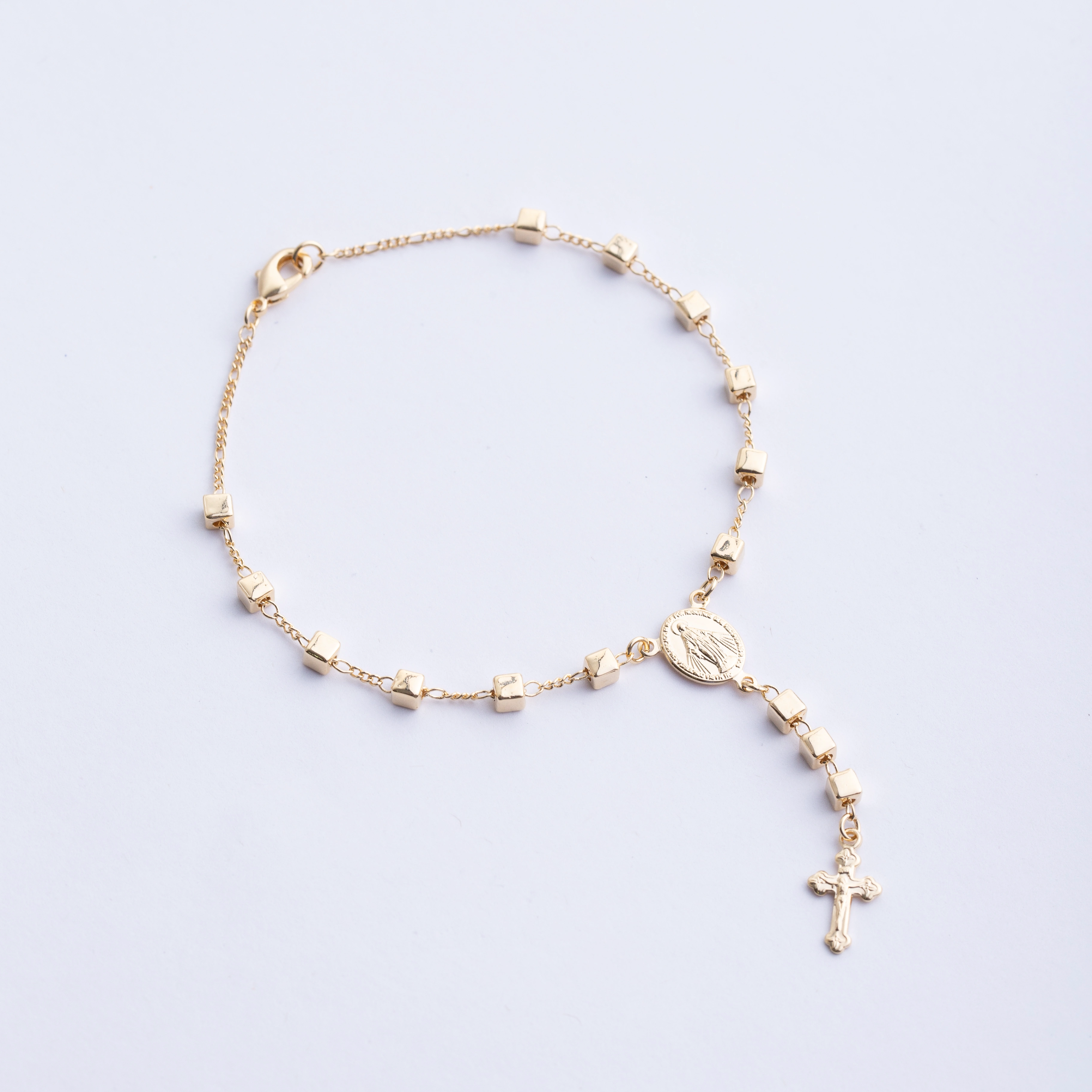Embrace a touch of spiritual elegance with our Square Bead Gold Rosary Bracelet. Finely crafted with 18k gold plating, this bracelet features unique square beads along a dainty chain, leading to a detailed medallion and a classic crucifix. It's the perfect way to keep your faith close and your style distinguished
