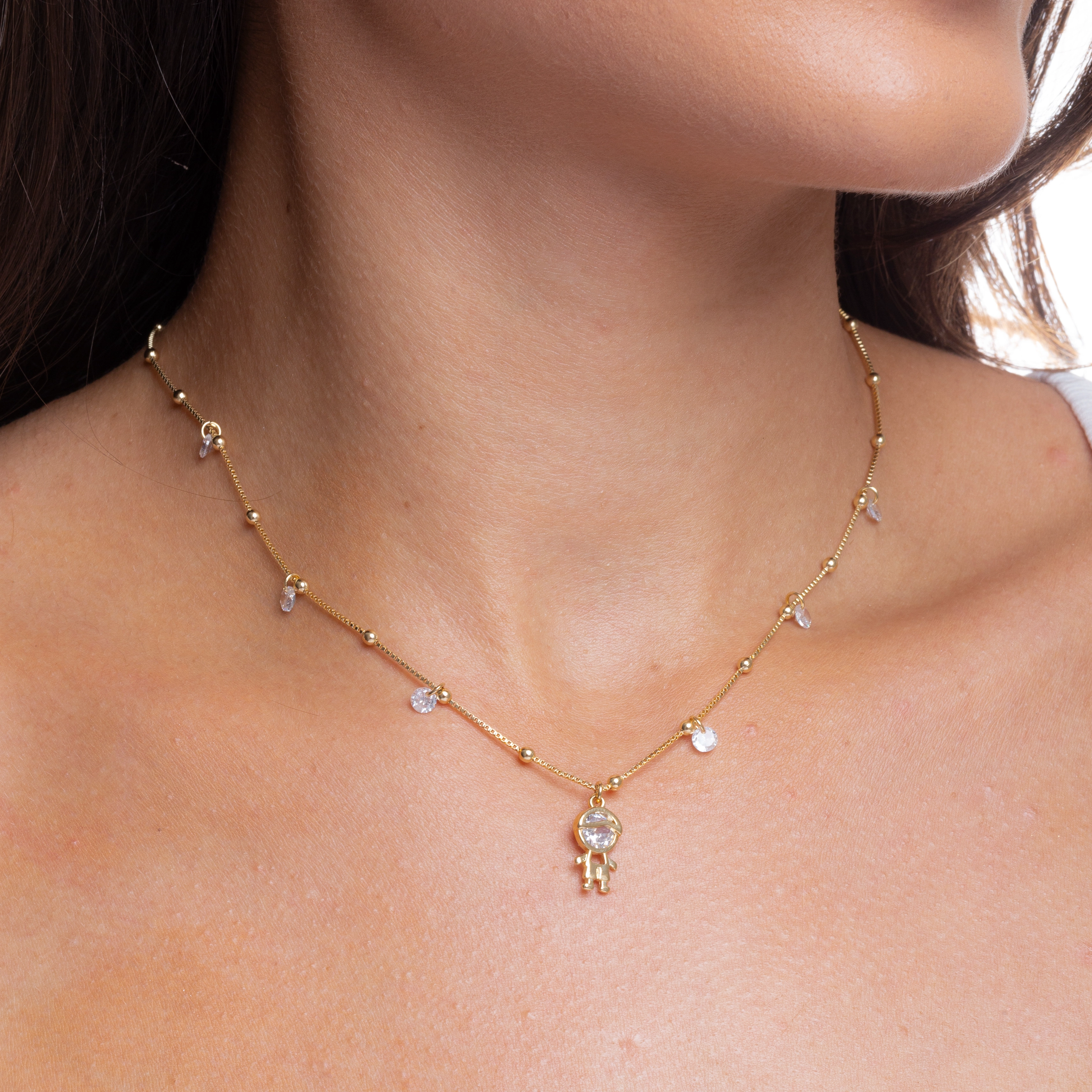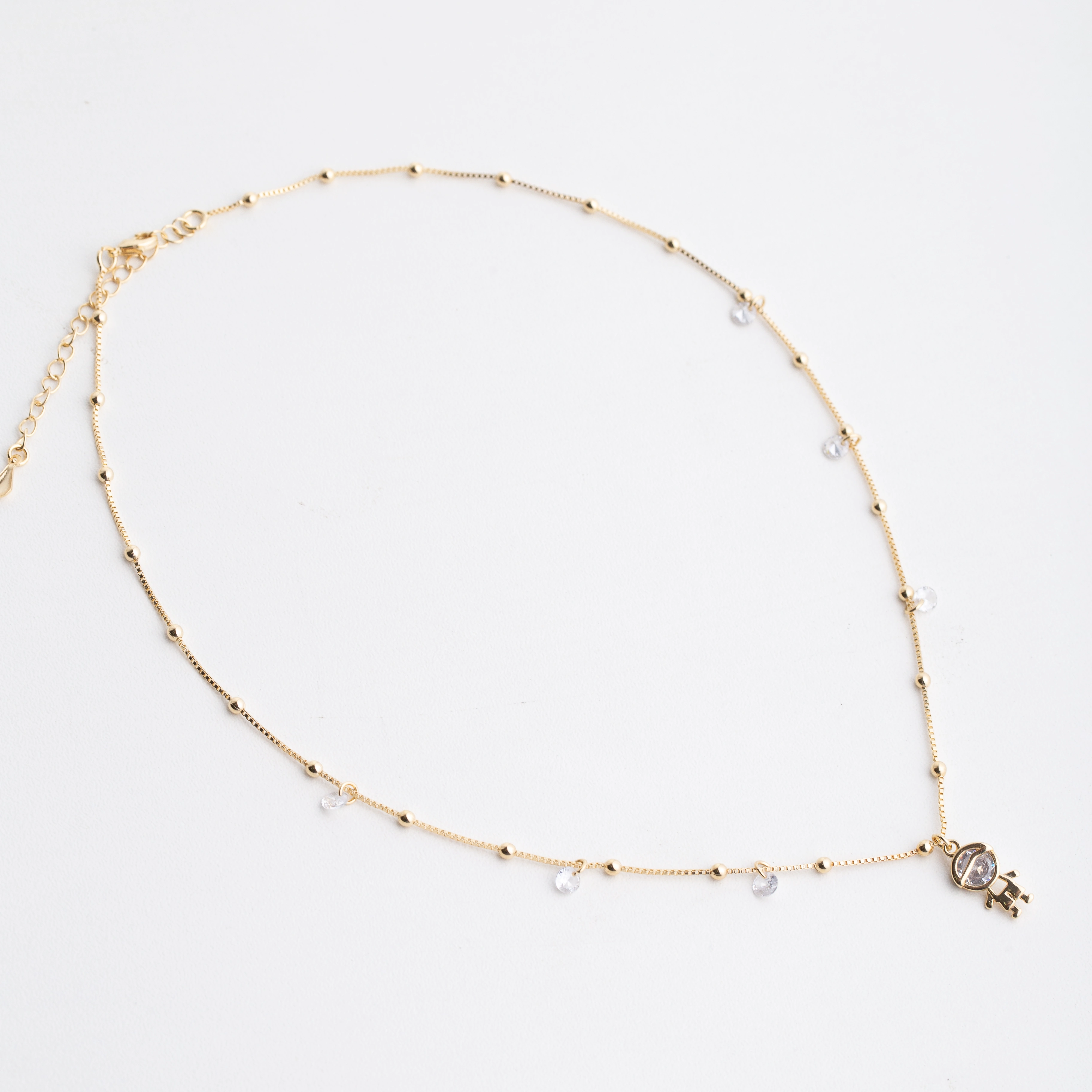 Experience innocence and purity with our "Child Charm Chain". This sophisticated box chain is meticulously embellished with clear crystals that sparkle with every turn, drawing focus to the charming child pendant that hangs delicately. It’s the perfect piece to celebrate familial love and tenderness, ideal for everyday wear or as a meaningful gift