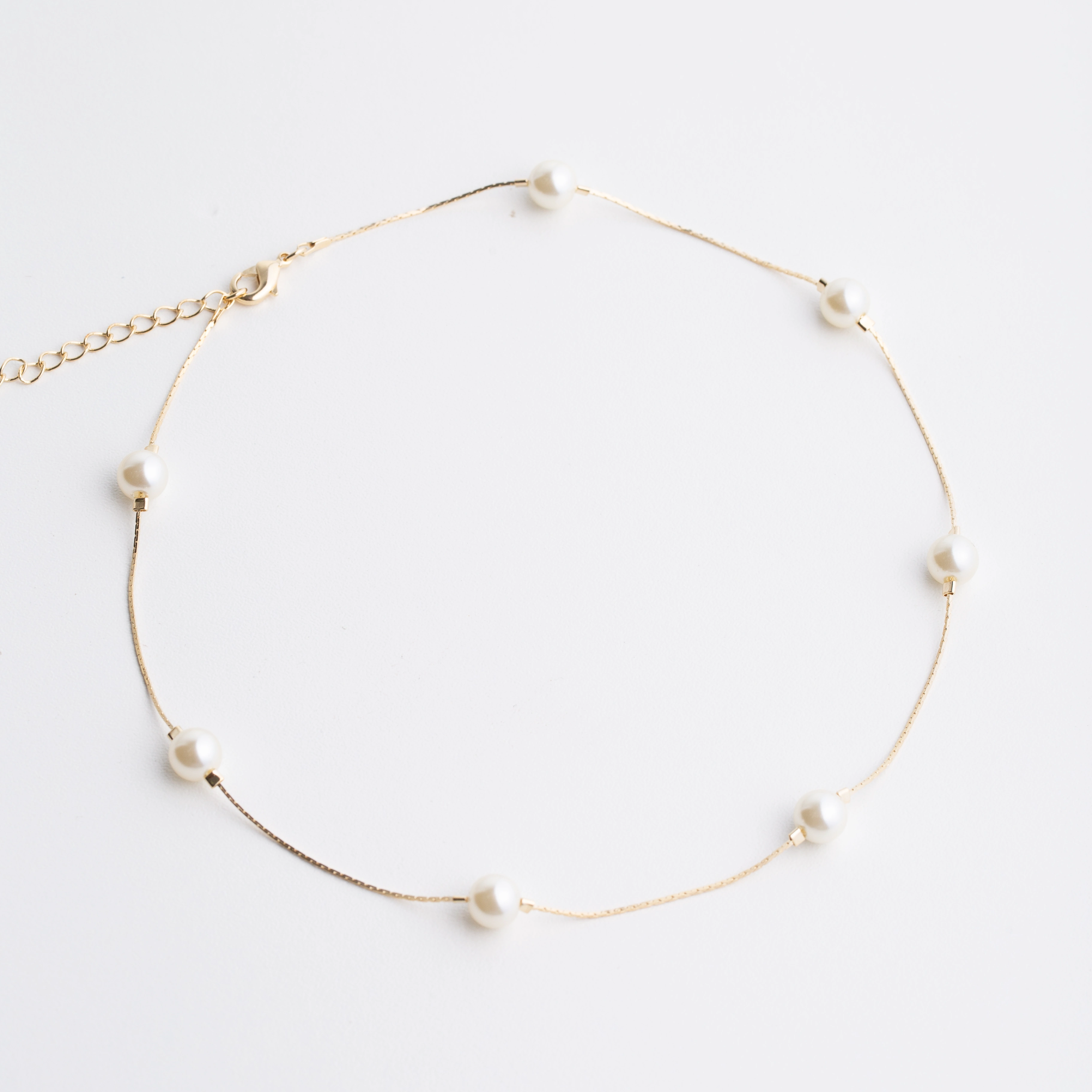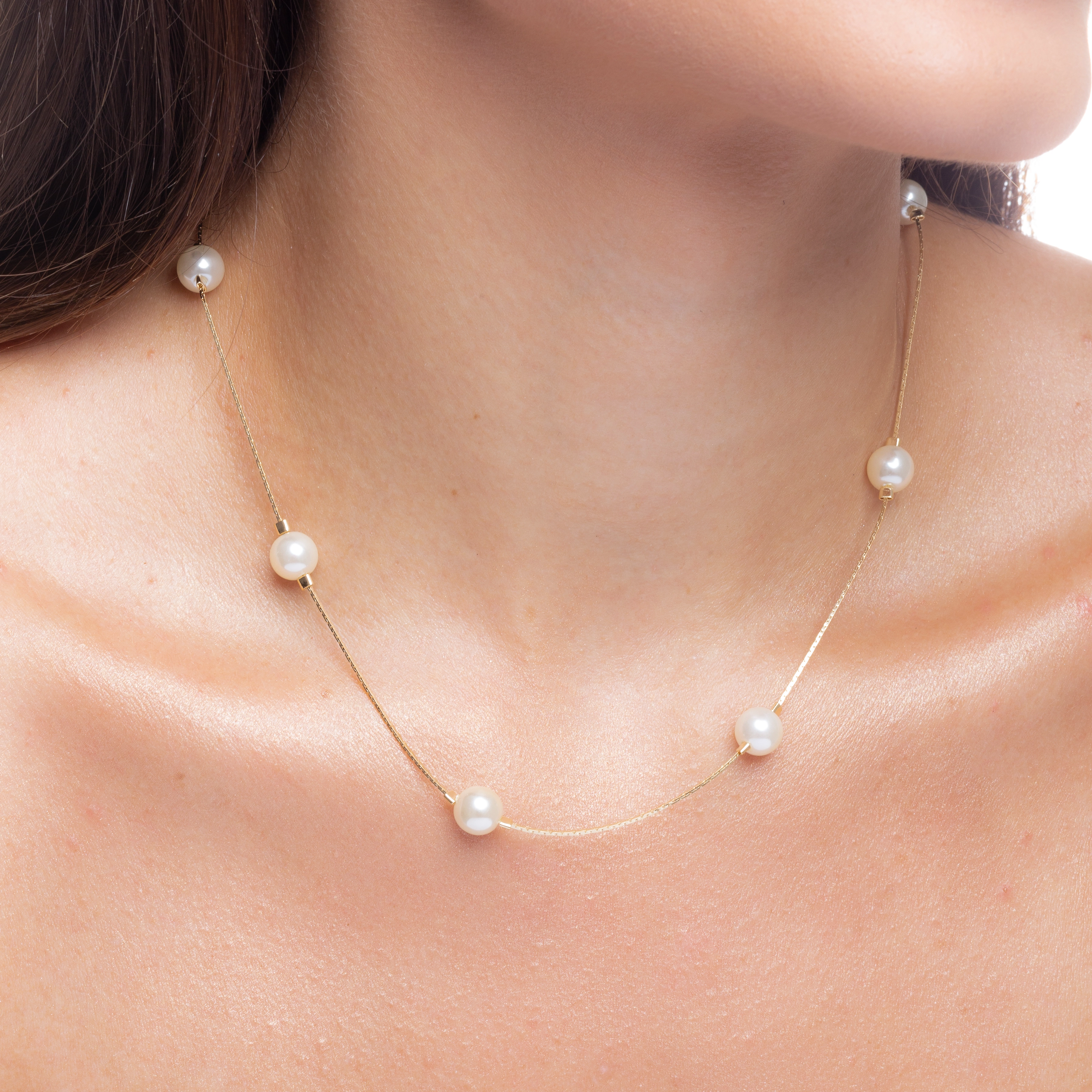 Elevate your style with this graceful pearl cascade necklace, a masterpiece of elegance and simplicity. This multi-strand necklace features a series of beautiful pearls evenly spaced along delicate golden chains. The arrangement allows each pearl to catch the light beautifully, enhancing their natural luster. The necklace's design makes it a versatile piece, perfect for layering or wearing alone for a minimalist look. Whether it's a day at the office or a night out, this necklace is sure to add a touch of class and sophistication to any outfit