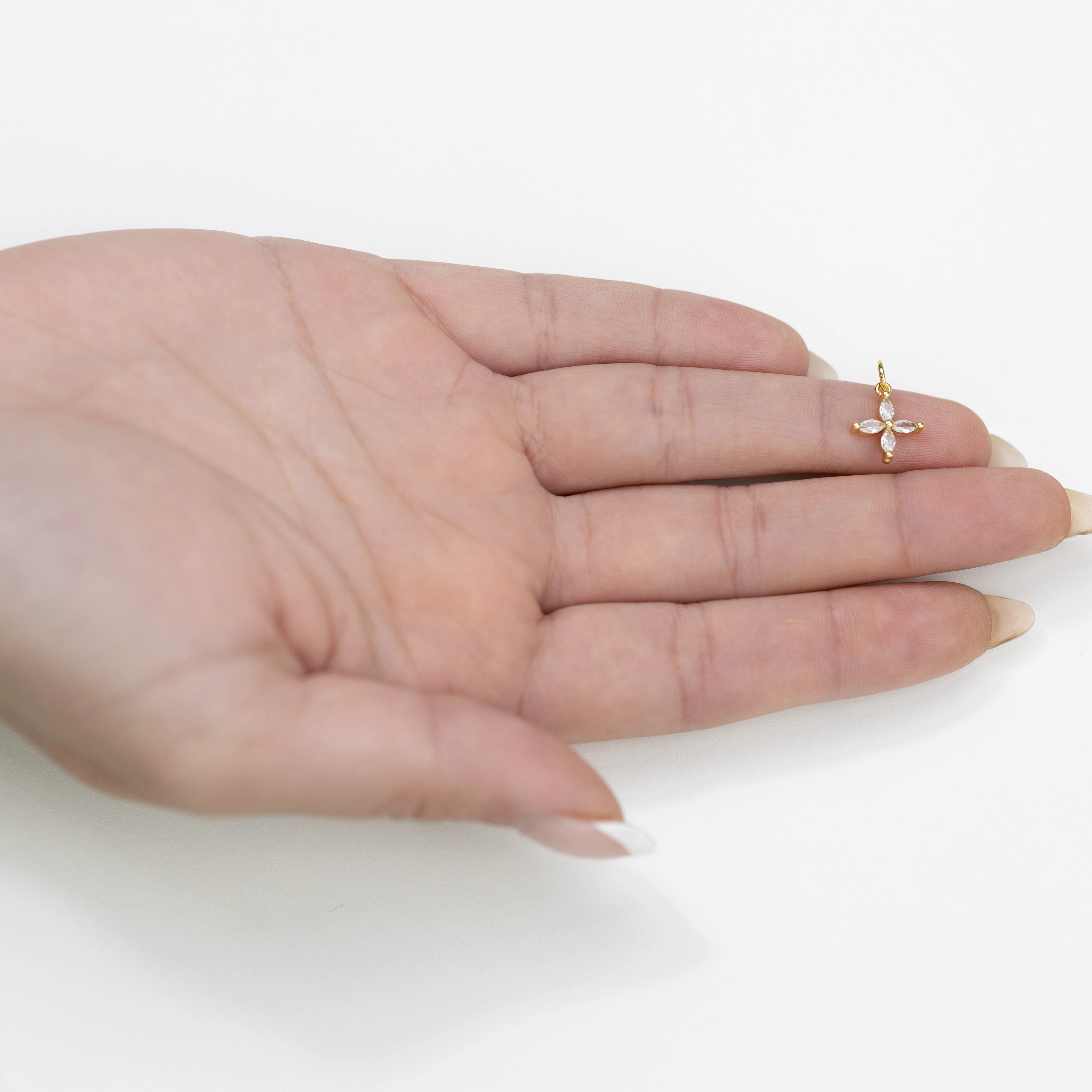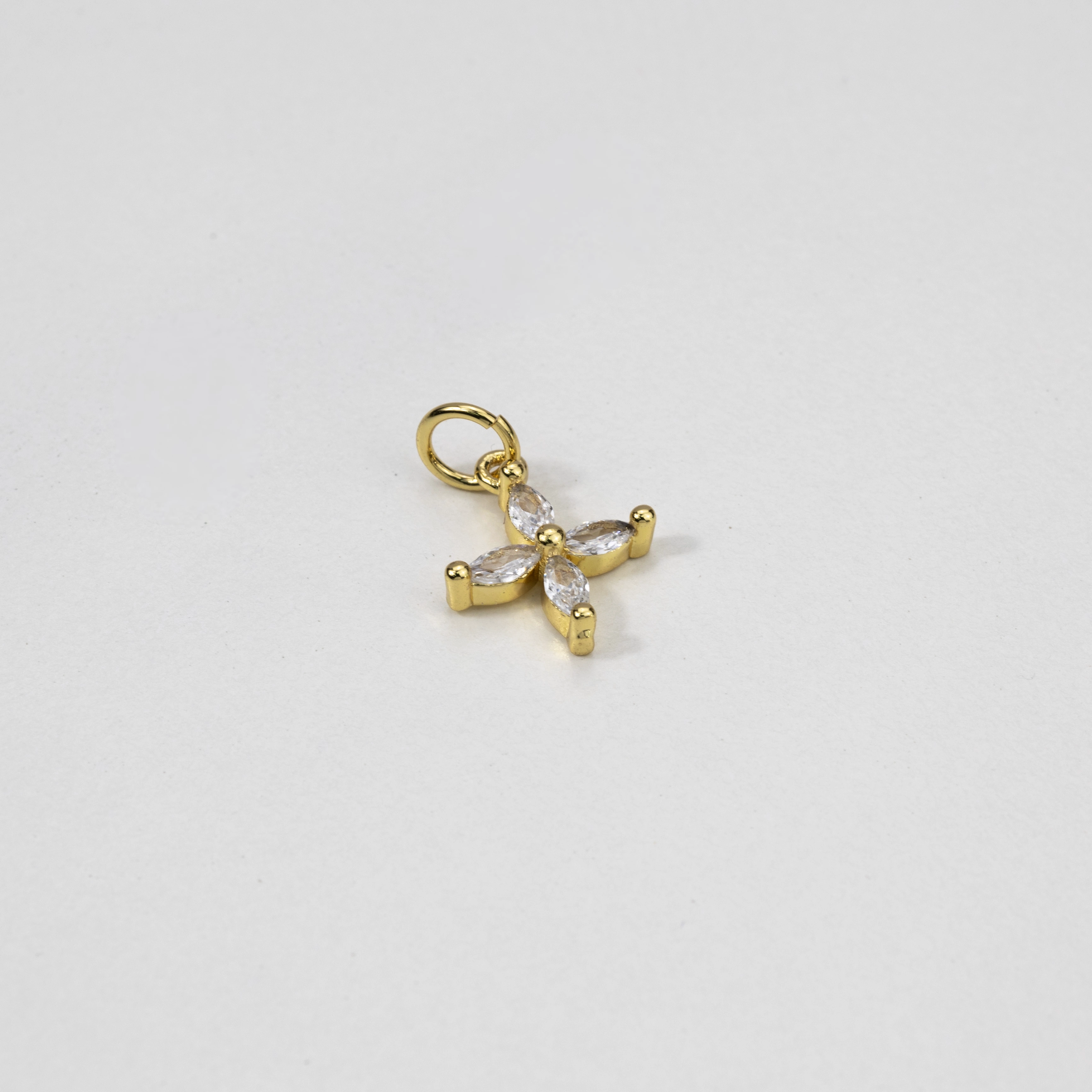 This captivating charm in the shape of a four-petal flower is a tribute to natural beauty, meticulously crafted in fine gold with clear crystals embedded in each petal. Symbolizing rebirth and purity, the flower sparkles with every movement, reflecting light spectacularly. This charm is perfect for those looking to add a touch of elegance and freshness to their style. Ideal for any occasion, from formal events to everyday wear, it is a versatile accessory that can be worn as a pendant on a chain or added to a charm bracelet