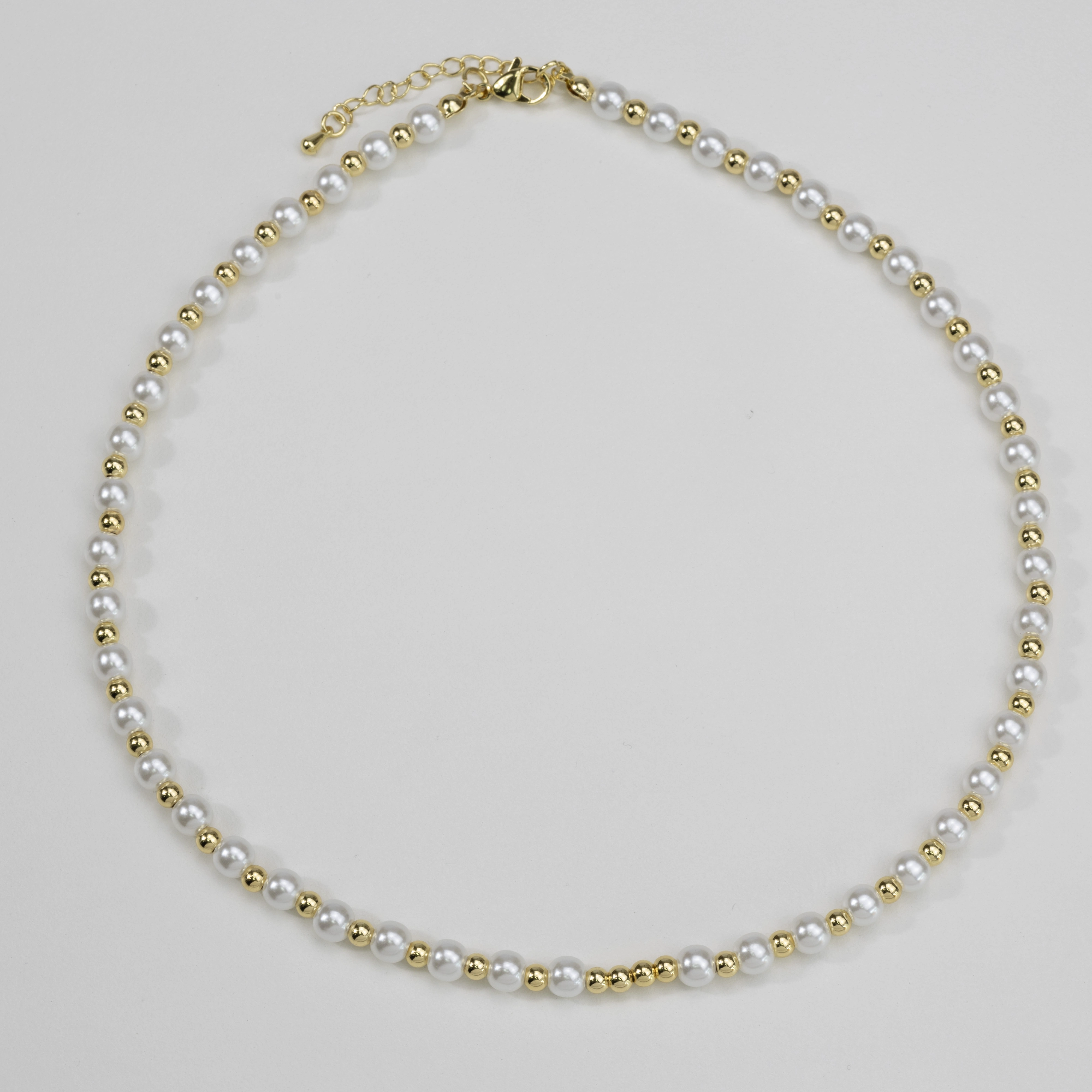 This elegant necklace combines the classic beauty of white pearls with the sophisticated shimmer of golden beads, creating a perfect balance between tradition and modernity. The design alternates pearls and golden beads in a pattern that adds visual interest and a touch of luxury to any outfit. Featuring a golden hook closure that allows for adjustable length, this necklace is versatile and suitable for a variety of occasions, from formal meetings to more casual events. It is an ideal choice for anyone looking to add a touch of timeless elegance to their jewelry collection