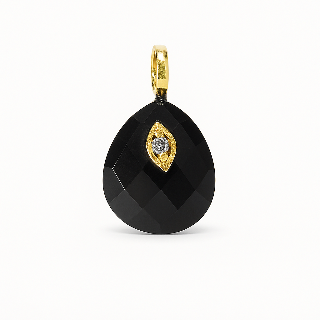 Meet our newest charm collection: faceted teardrop pendants in natural stones (amethyst, lapis, malachite, amazonite, rose quartz, tiger’s eye, labradorite, onyx, teal agate and opal-like clear). Each piece features a tiny marquise evil-eye with a sparkly crystal and a polished gold-tone bail. Perfect for minimalist necklaces, layering, or DIY creations.