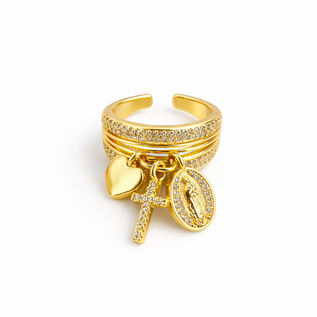 Adjustable gold-finish ring featuring a layered stack-style design with sparkling CZ pavé details for an elegant shine. Finished with dangling charms—a CZ cross, a religious medal, and a polished heart—for a modern, faith-inspired look. Wear it as a statement piece or mix it with other rings for a trendy stack
