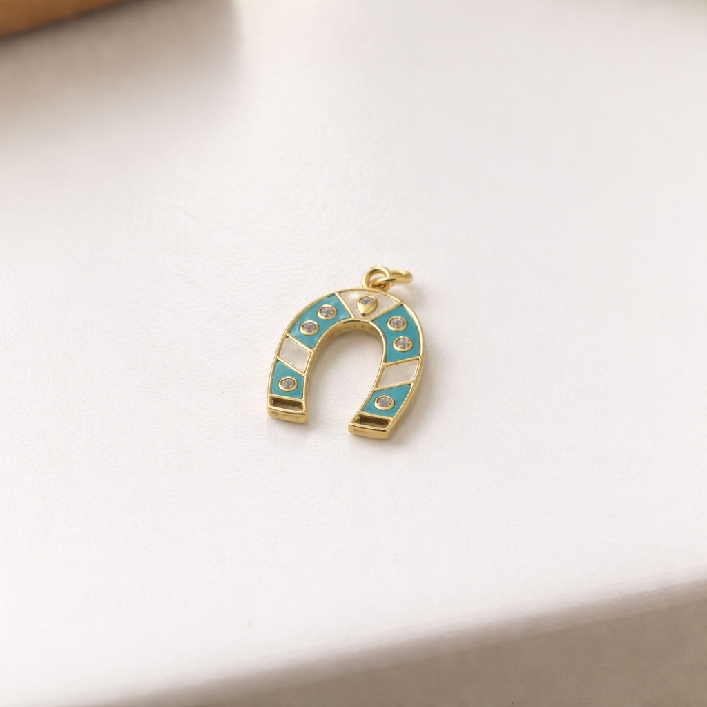 Horseshoe-shaped charm featuring a polished gold finish, turquoise enamel accents, pearly details, and delicate zircon stones that add sparkle and elegance. Its modern and eye-catching design makes it perfect for necklaces and custom jewelry pieces.