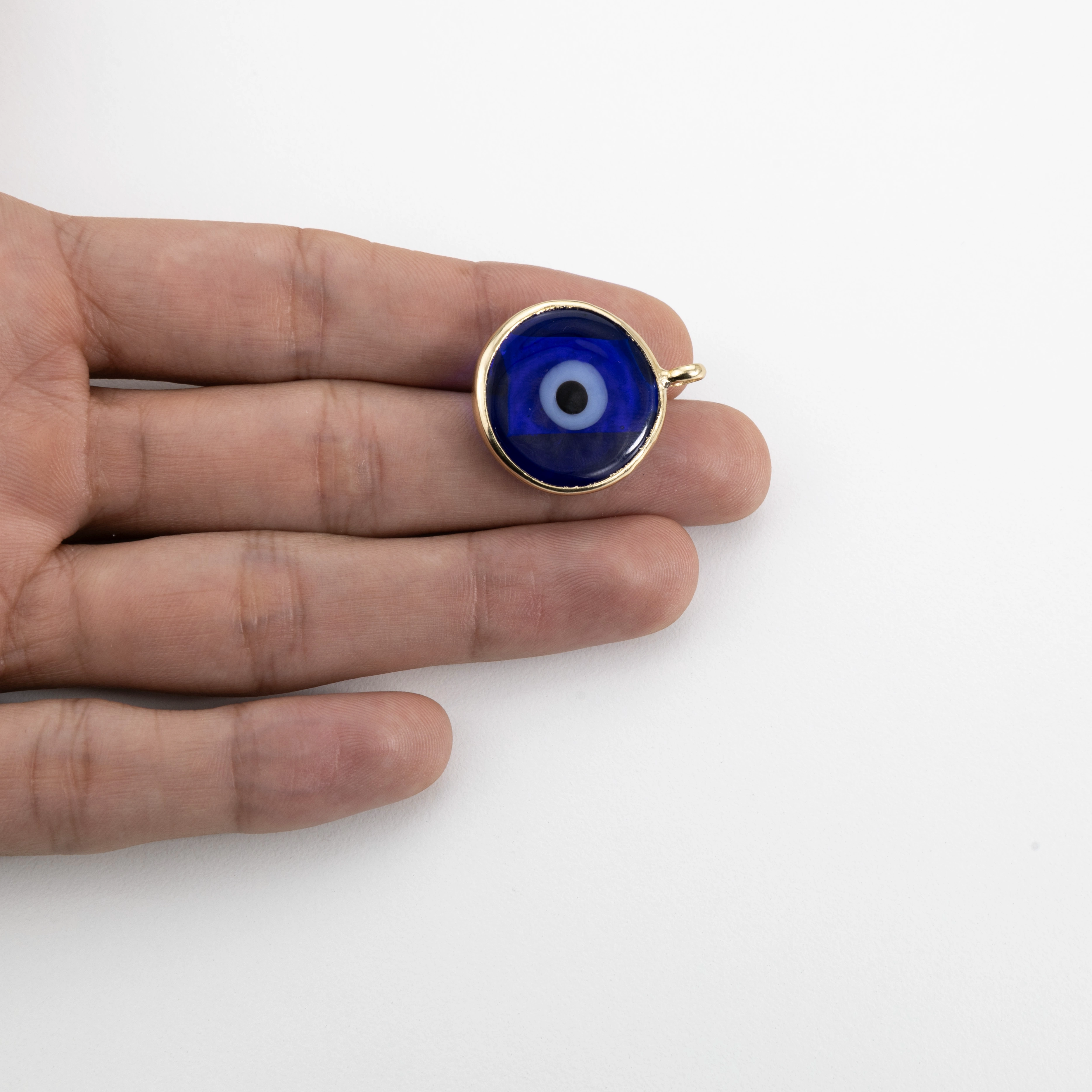 This charm features the iconic eye motif in a harmonious blend of blue and white, set within a round bezel frame.